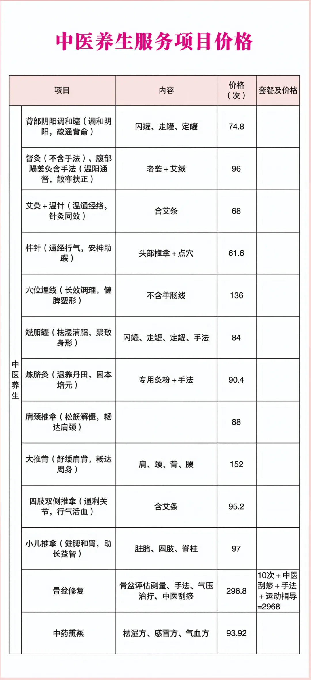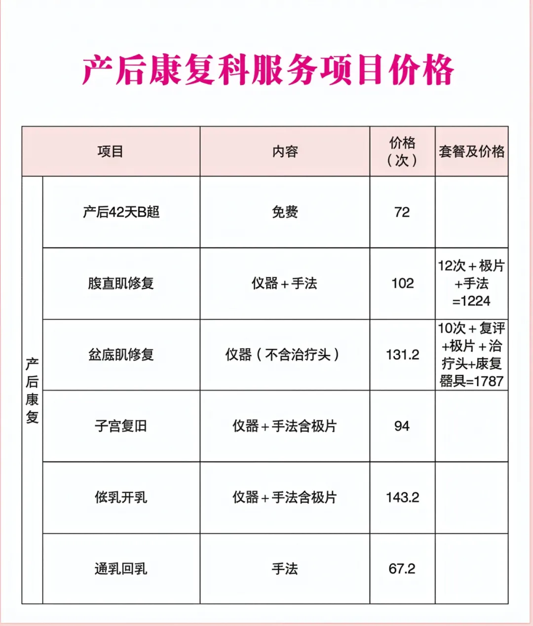 产后康复科项目价格