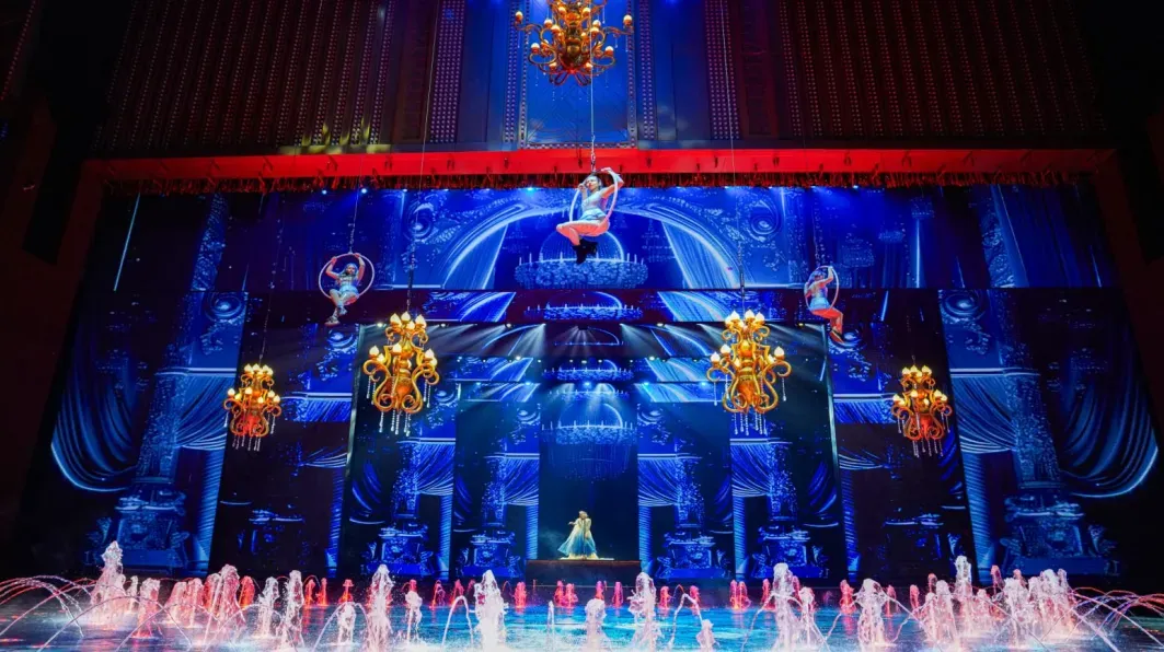 走进场馆,水幕投影与喷泉特效在灯光映衬下提前营造出奇幻氛围。