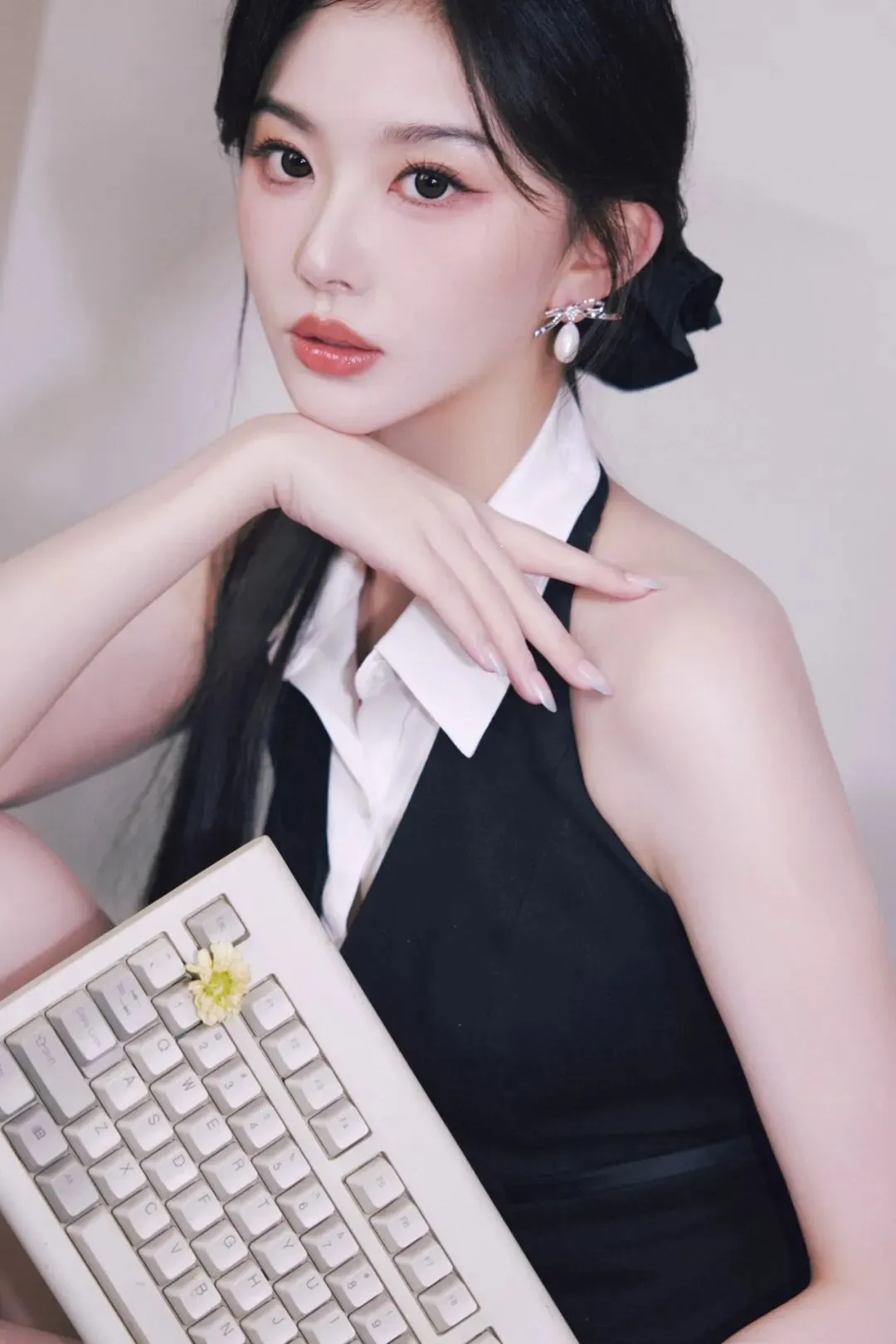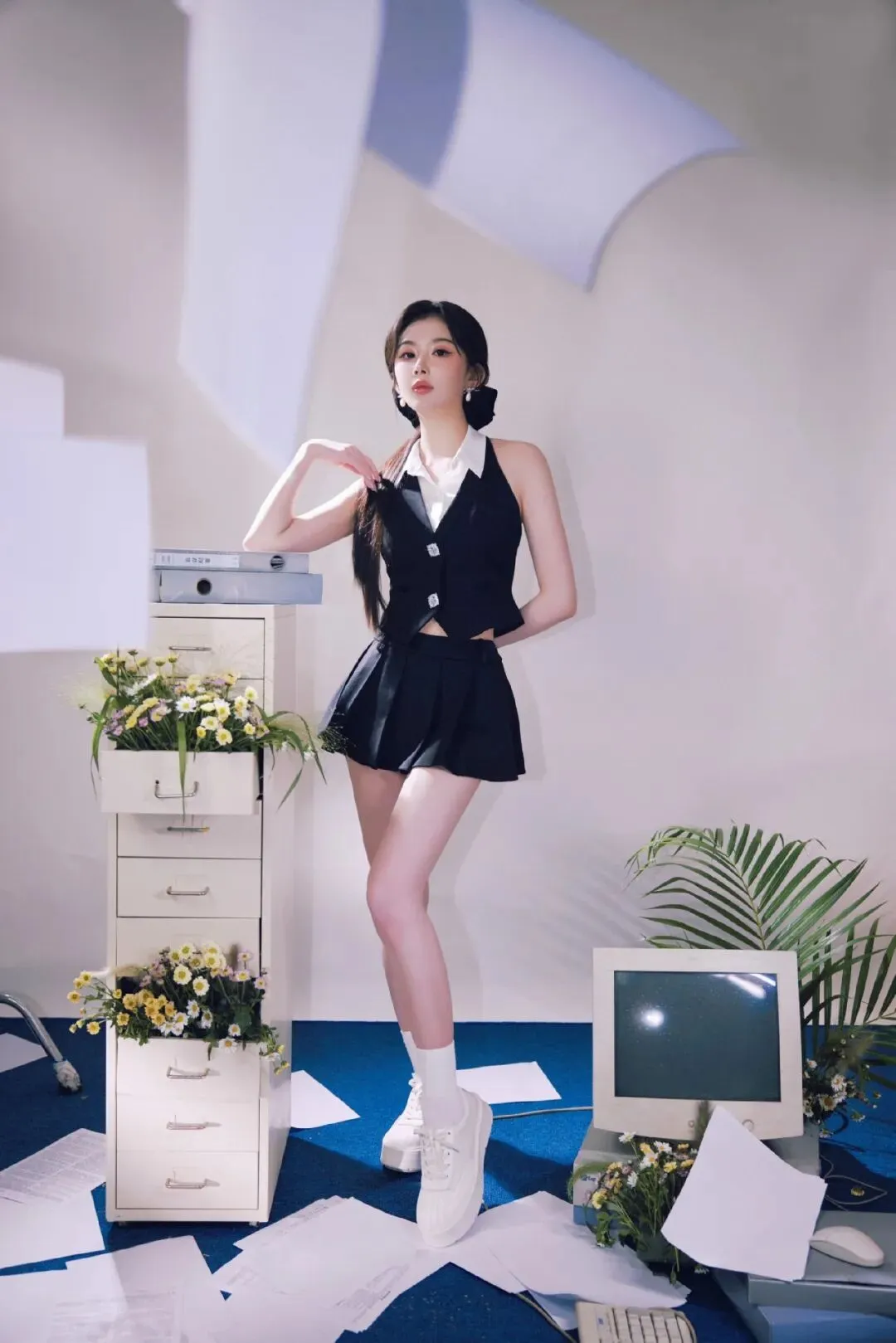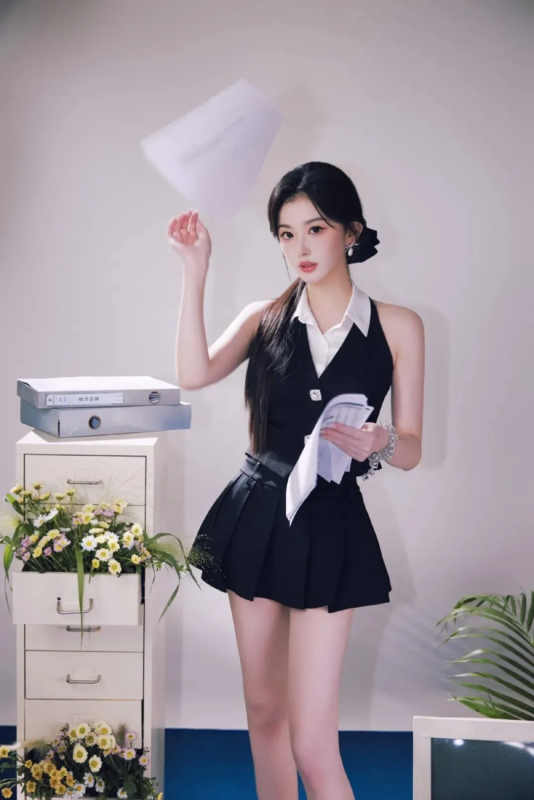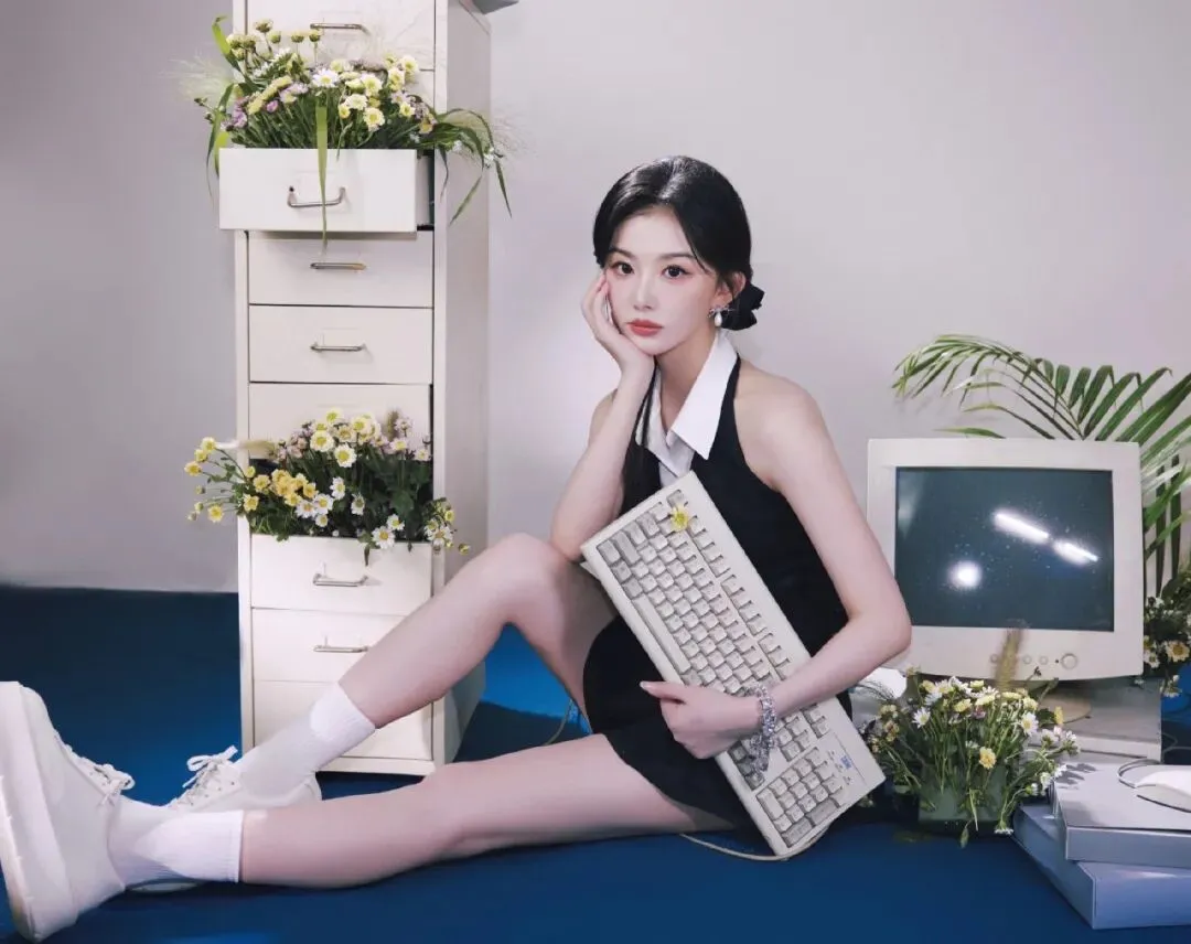 当然,画面中的动感造型也十分贴合这一身穿搭。你看孔雪儿时而抛洒文件元气满满,时而抱着复古键盘慵懒倚靠,黑长直发丝扫过锁骨,清透的裸妆衬得皮肤像剥了壳的荔枝。