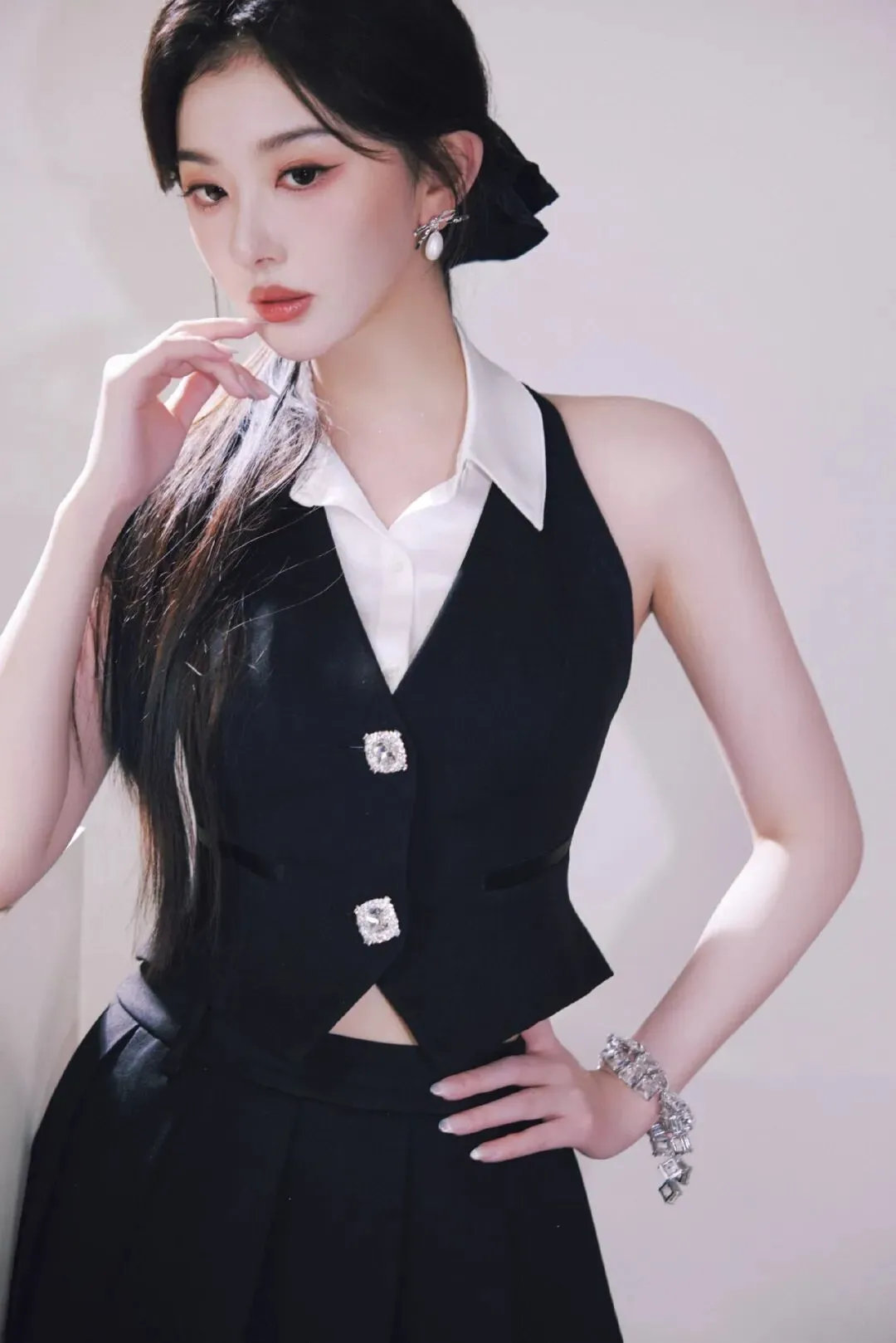 孔雪儿这一身穿搭状态,小编用 “元气秘书” 四个字来形容不过分吧?黑色挂脖马甲搭配白衬衫的经典组合,太有职场感了。