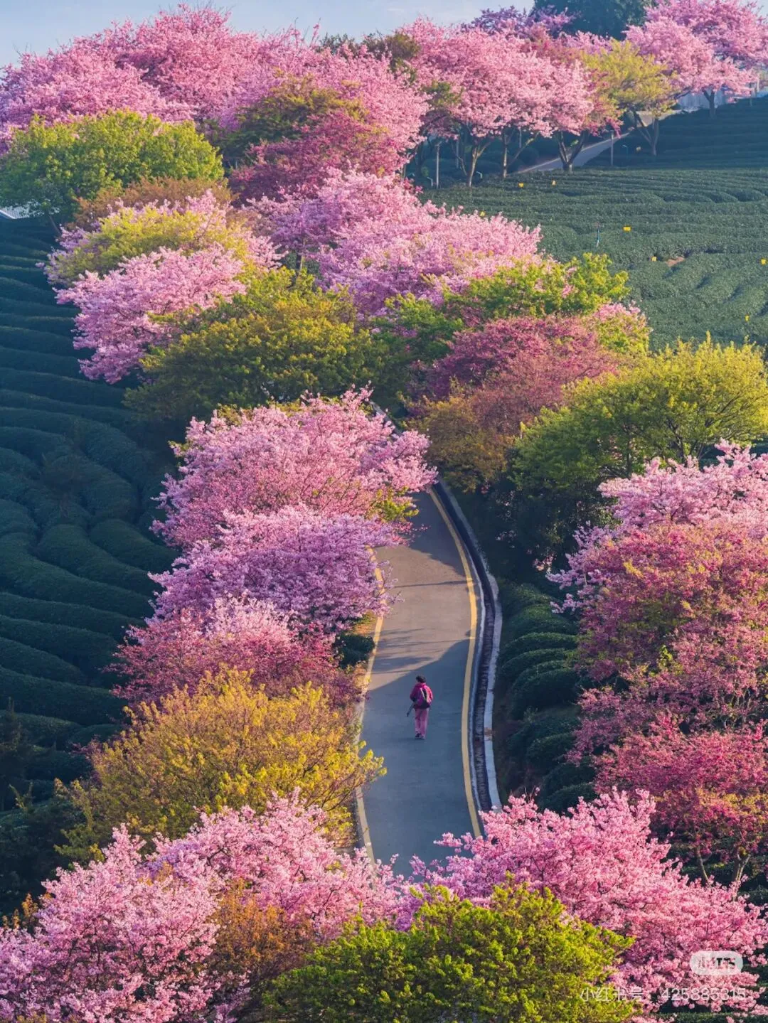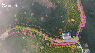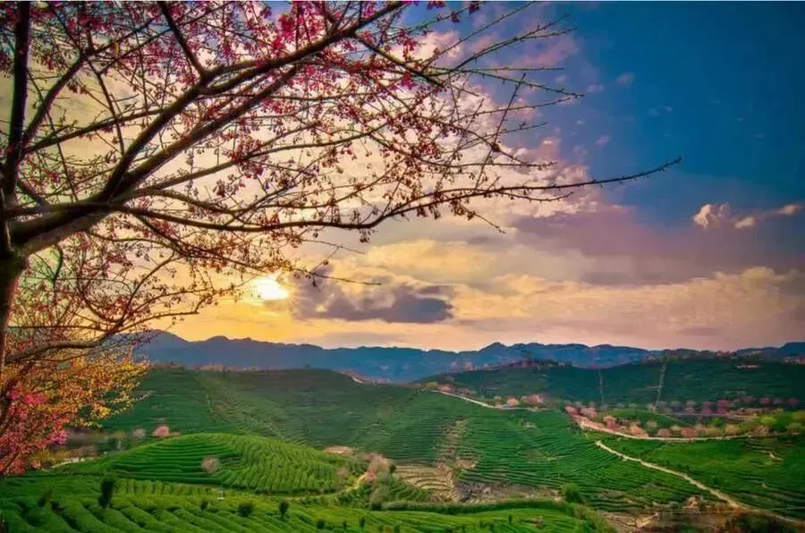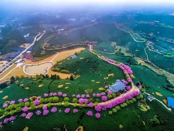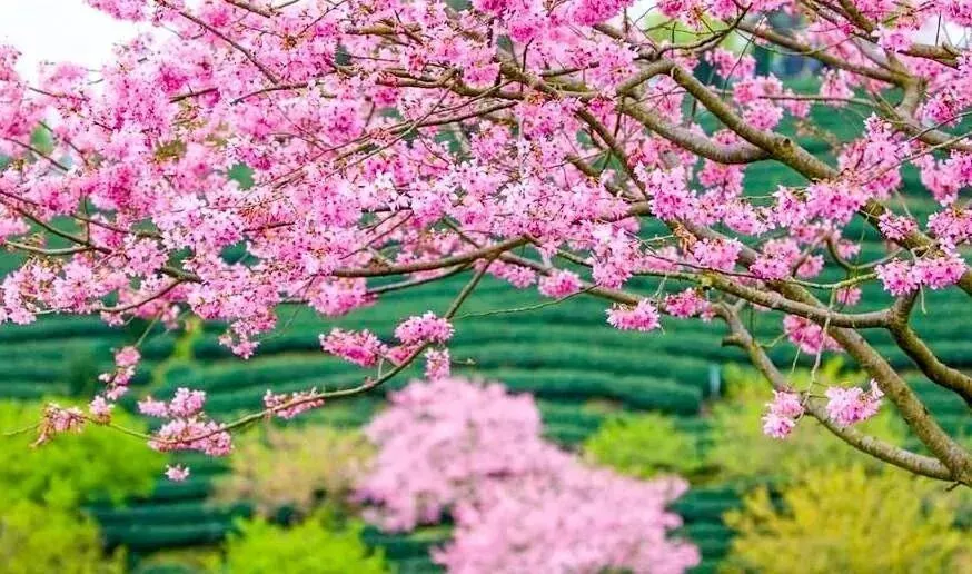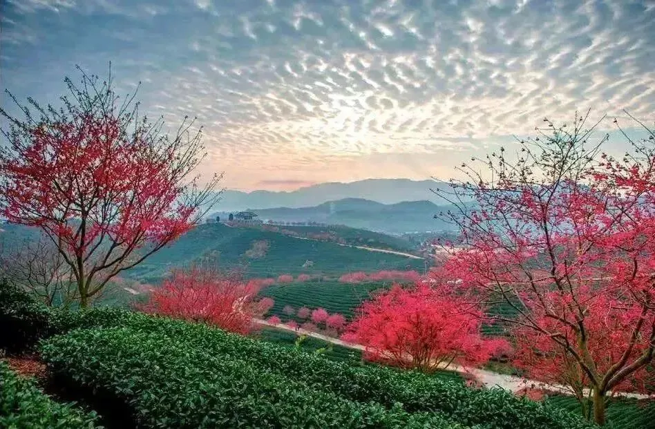 茶绿樱红!红色的樱花与满山碧绿的茶叶交相辉映,远远望去,依茶山走势种下的一棵棵盛放的樱花,像极了五线谱上跳动的音符,谱写着茶树与樱花相恋相守的浪漫乐章,茶园清新,樱花娇艳,景观美极了!