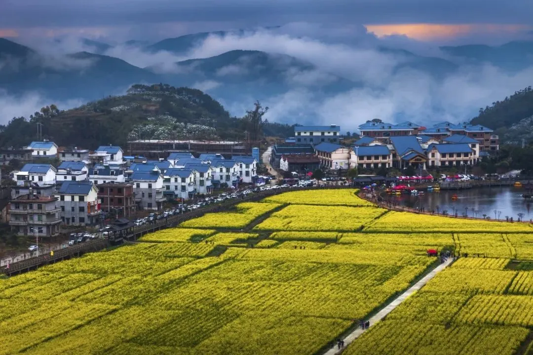 百亩油菜花在阳光下一片金灿灿的田园景象,美不胜收,四周群山屏立,中间地势平缓,房屋整齐有序地环绕在油菜花海两侧,故而得名“坪盘”。