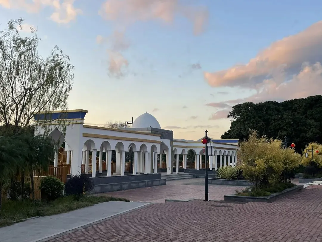 位于鉴湖中段,是一座富有回族特色的白色圆顶建筑,与蓝色的天空交相辉映,显得整洁而清新。