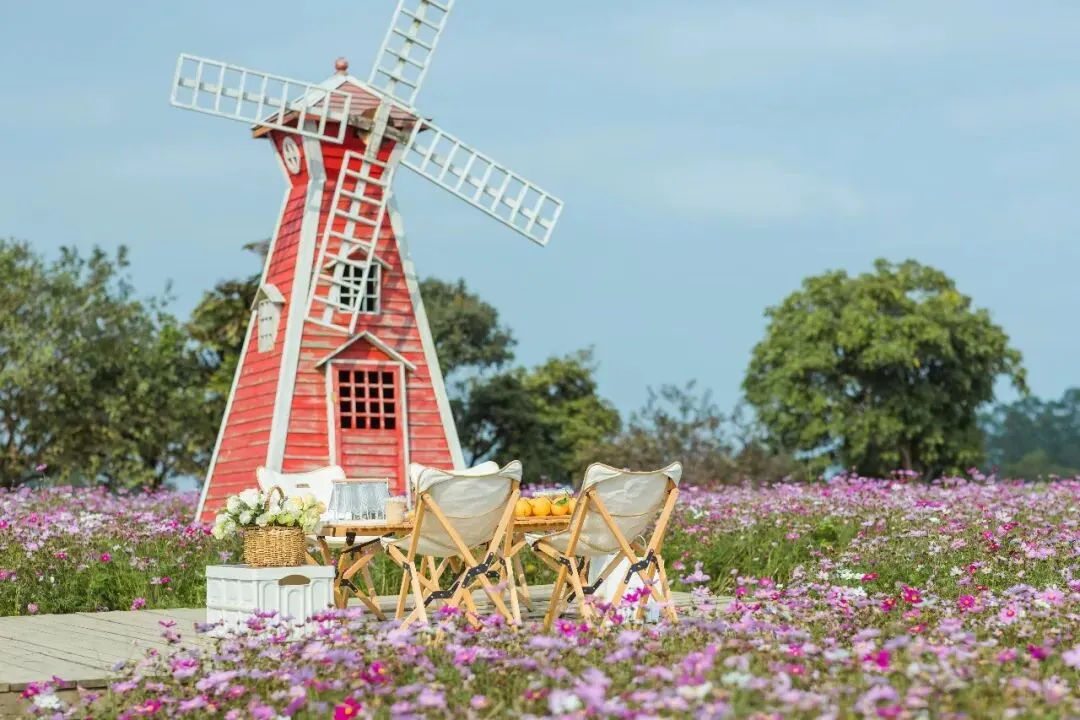 园区专属露营区搭起森系帐篷集群,遮阳棚 + 休闲桌椅全套配齐,阳光透过花叶洒下斑驳光影,伴着清甜花香开启惬意时光。