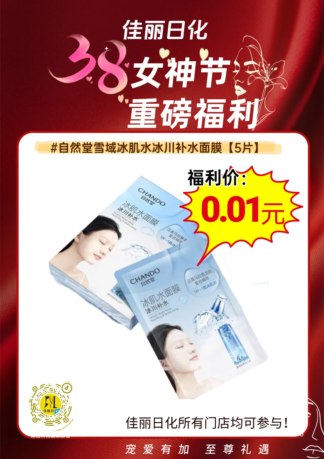 【佳丽日化】女神节福利来袭 自然堂雪域冰肌水补水面膜5片,福利价只要0.01元!!