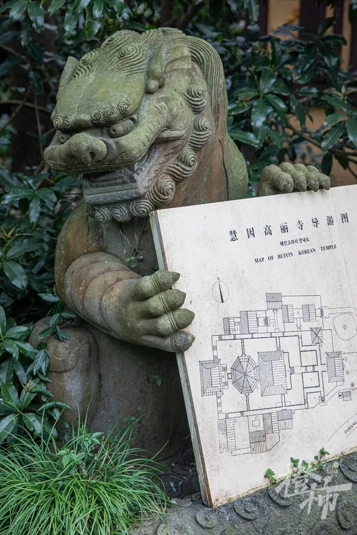 寺门口的石兽“托举”着导览图