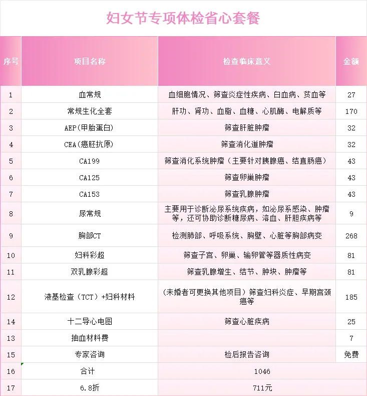 在女神节即将到来之际,我院体检科为广大女性朋友带来“硬核福利”,体检套餐全部享受6.8折福利。