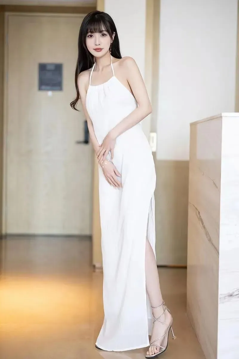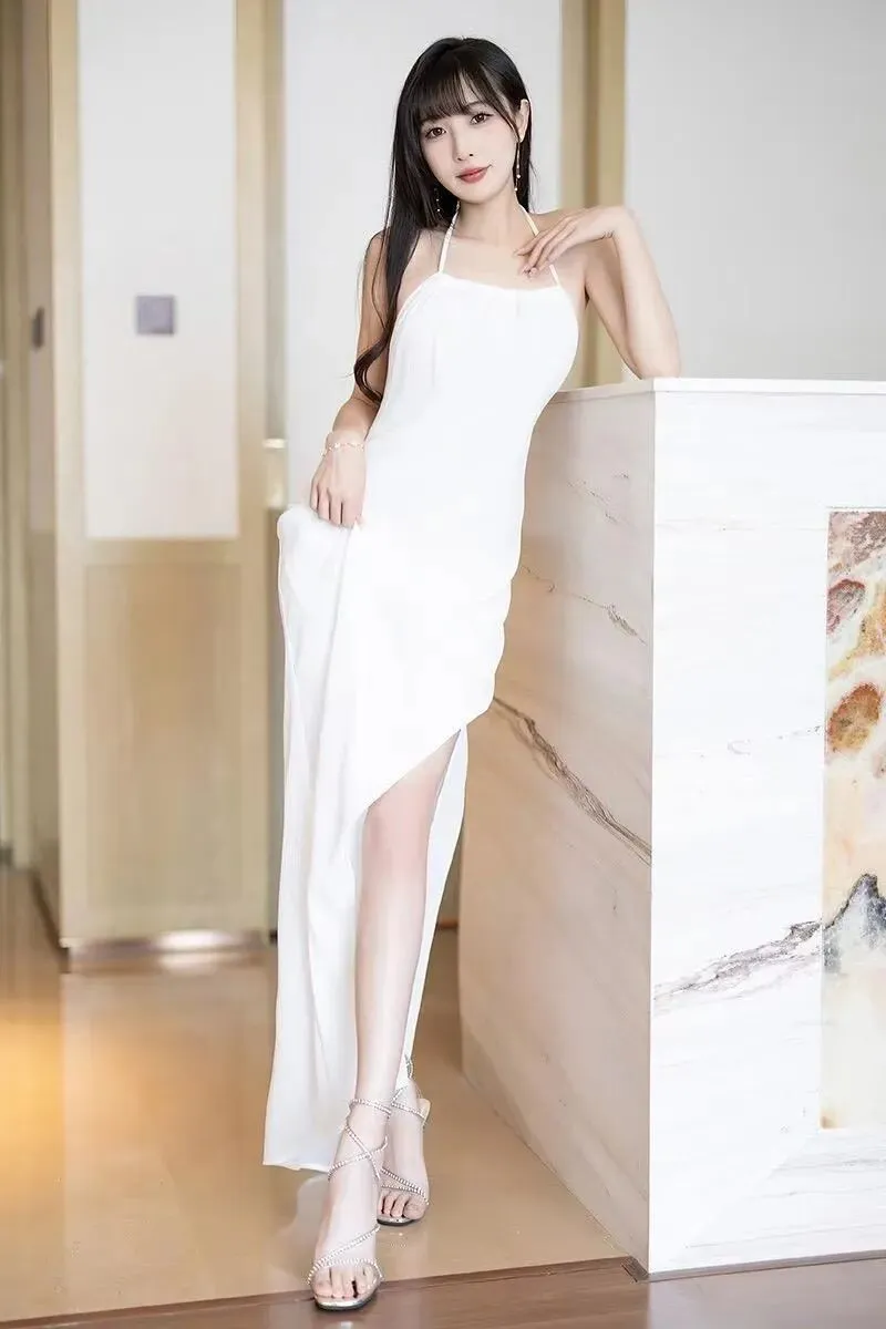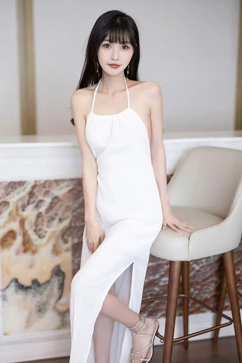 1. 白色挂脖式高开叉长裙