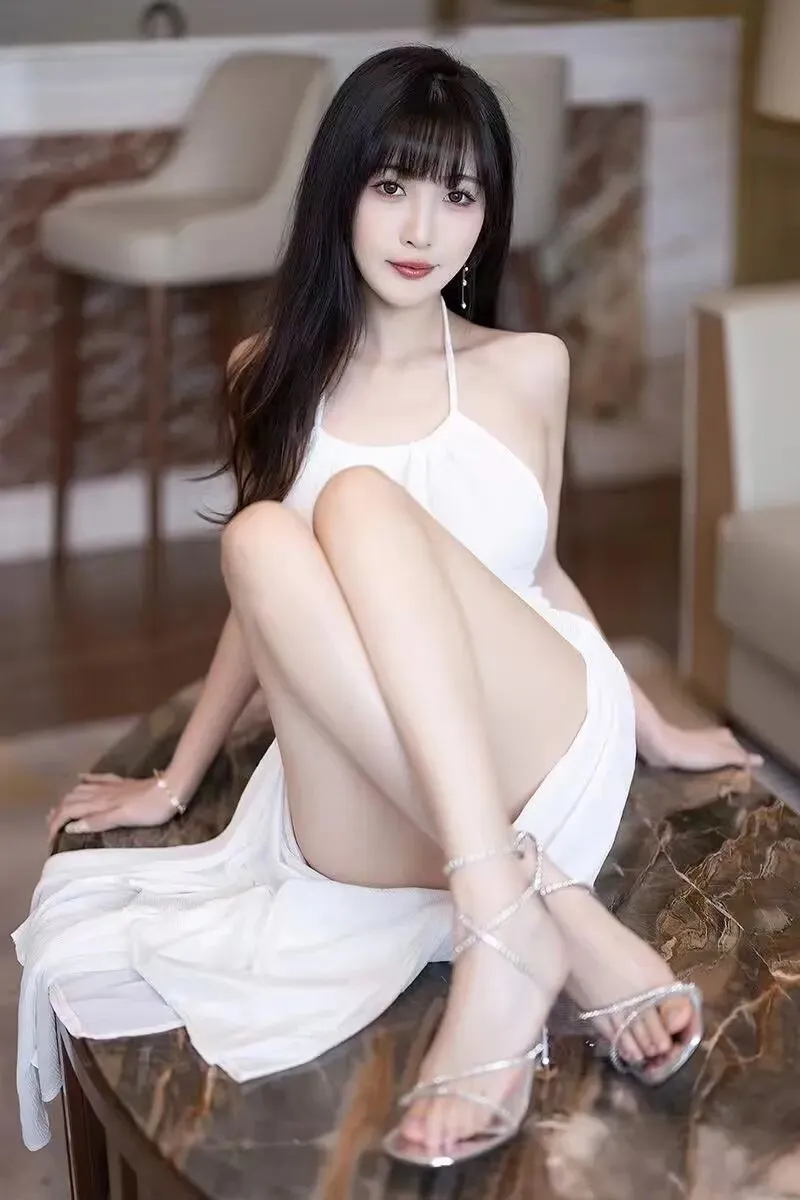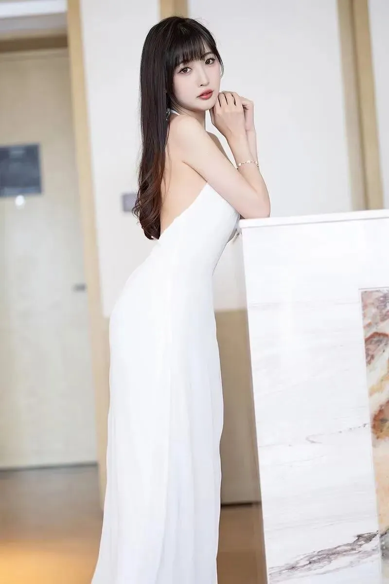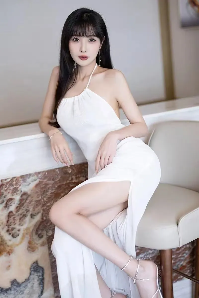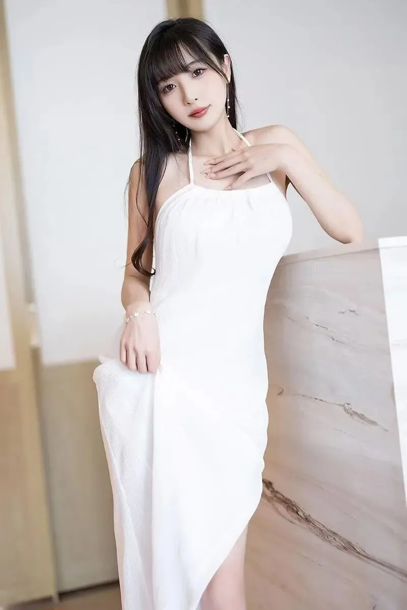 1. 白色挂脖式高开叉长裙