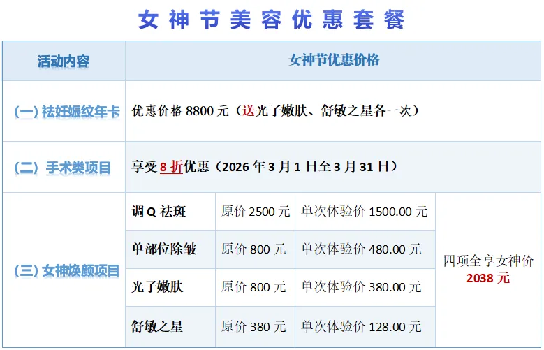 3月1日-3月31日前预约活动,可享超低优惠!活动套餐如下。