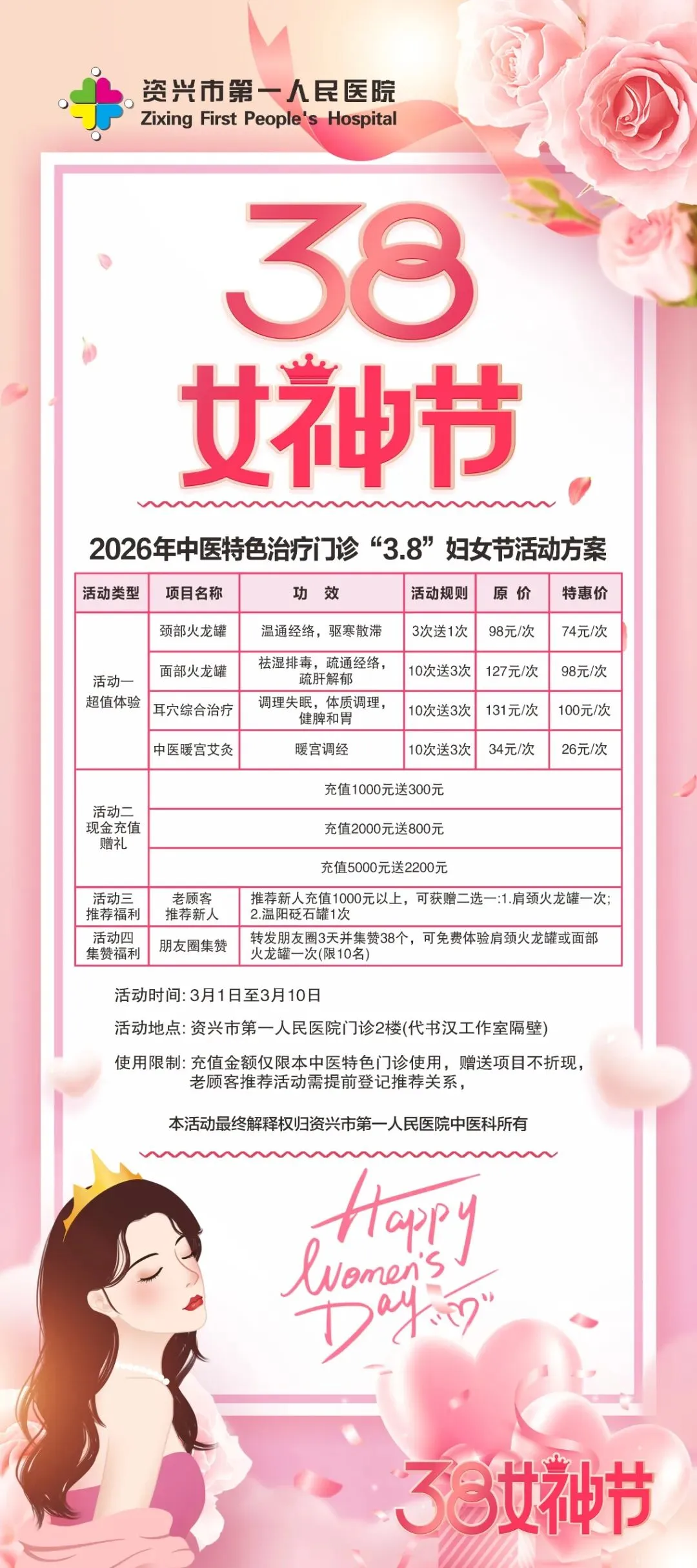 当前位置:首页>美女资讯>女神节“惠”健康 ‖资兴市第一人民医院中医特色门诊四重福利,宠你到底