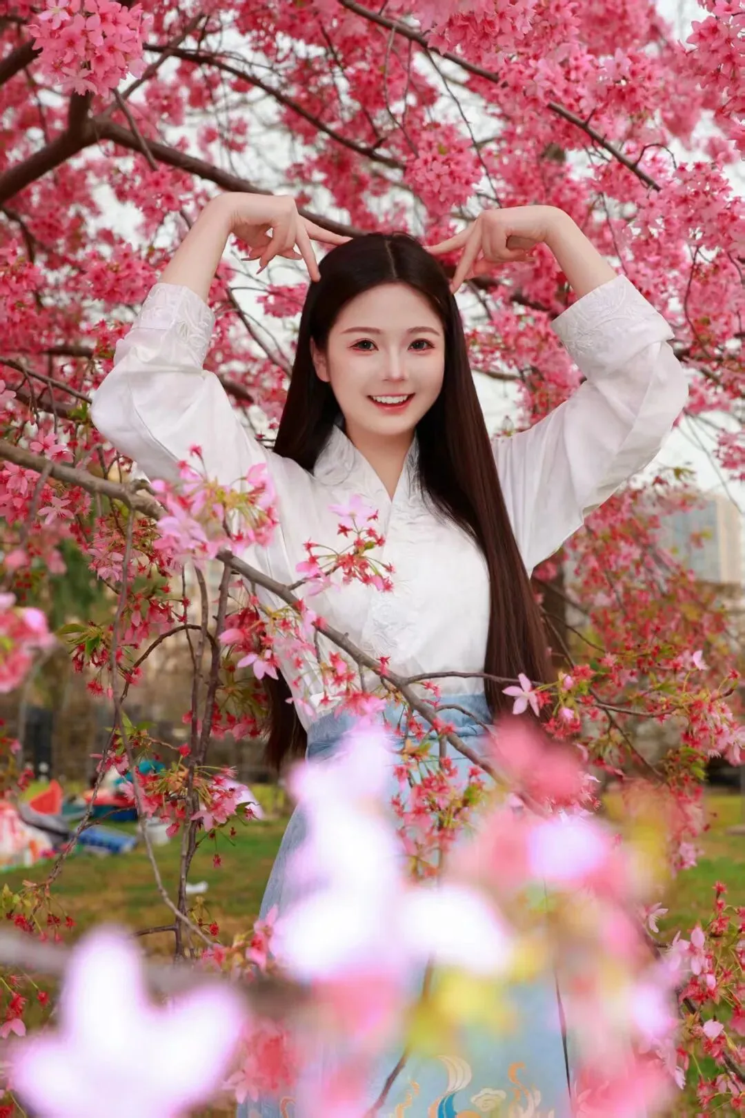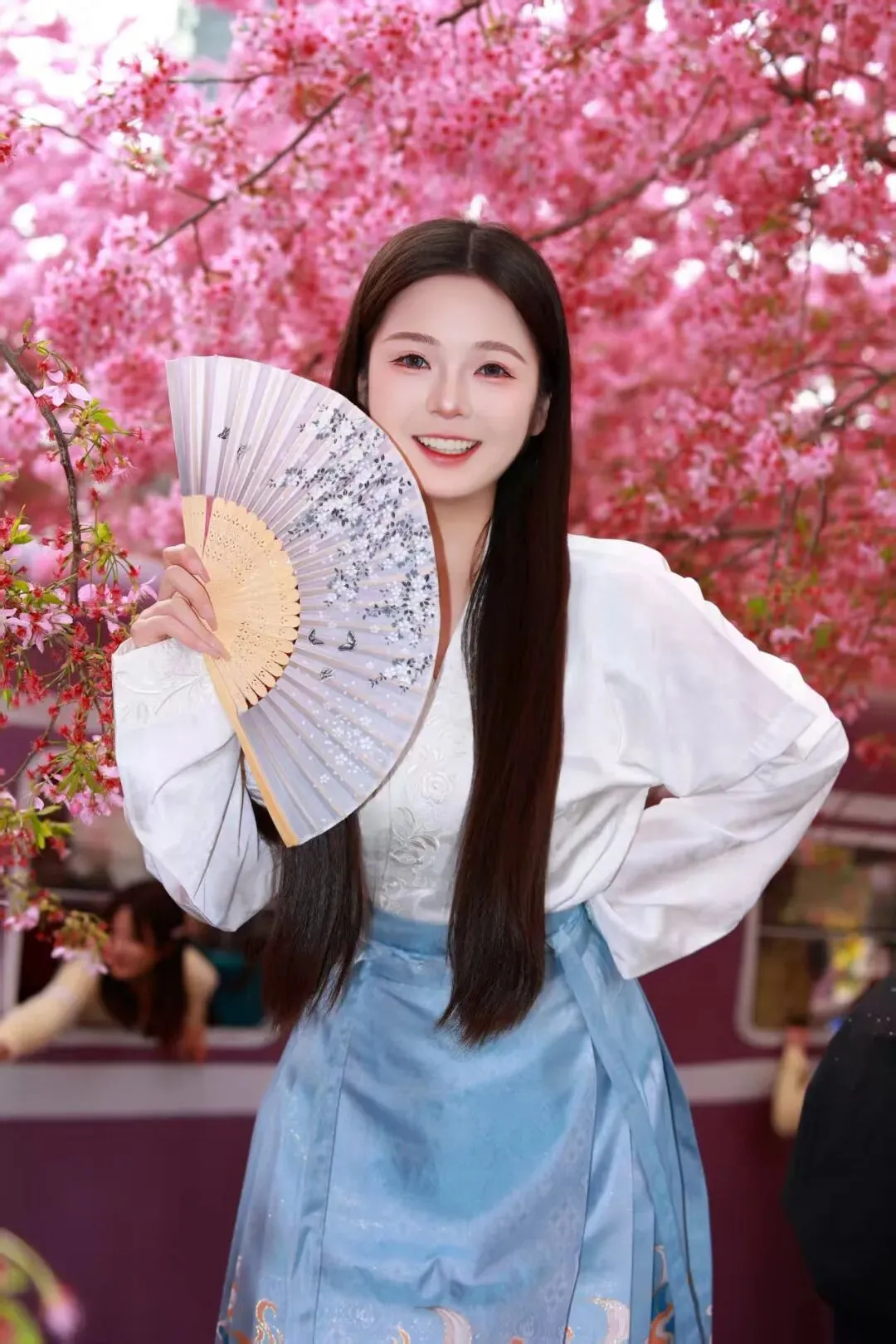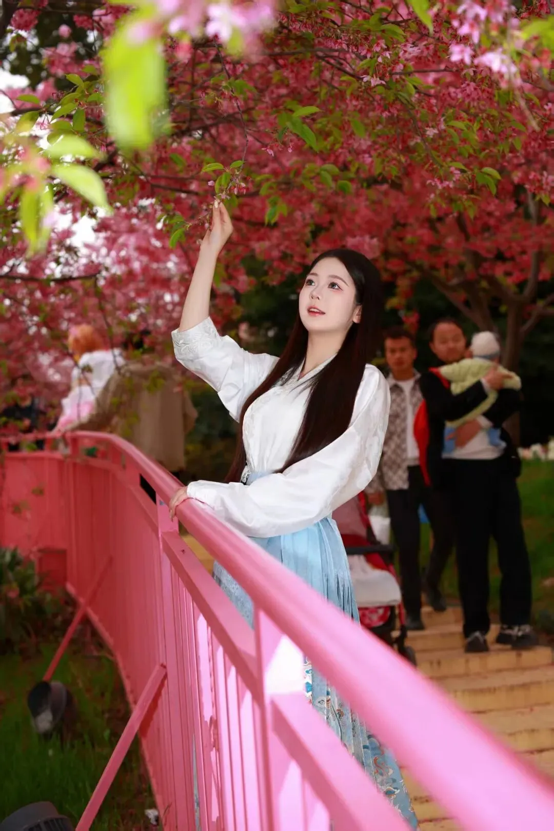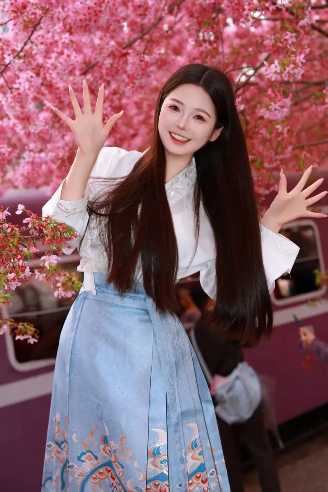 星星霞老师的表现力直接拉满,白上衣搭配蓝底马面裙,在粉樱背景里干净又温柔,每一个神态都很出片,阴天也拍出了满屏春日氛围感。
