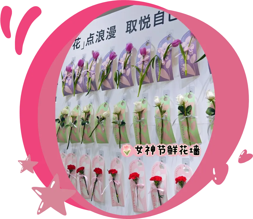 入营签到:鲜花墙签到,女生自选鲜花,摘下后签上自己的名字。