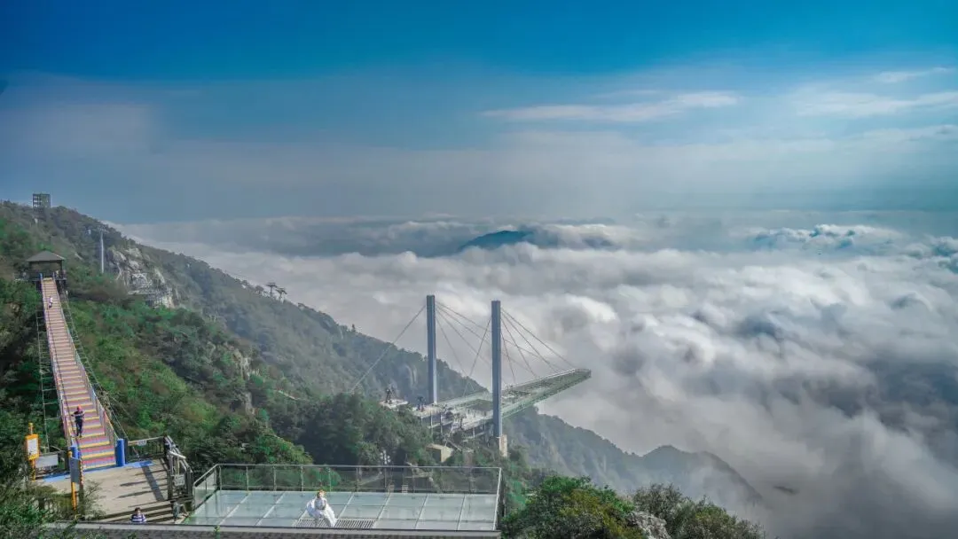 【云海栈桥】全长131.4米,晃晃悠悠徜徉云海,山下雾气凝聚升至山顶,栈桥上犹如腾云驾雾、置身仙境。