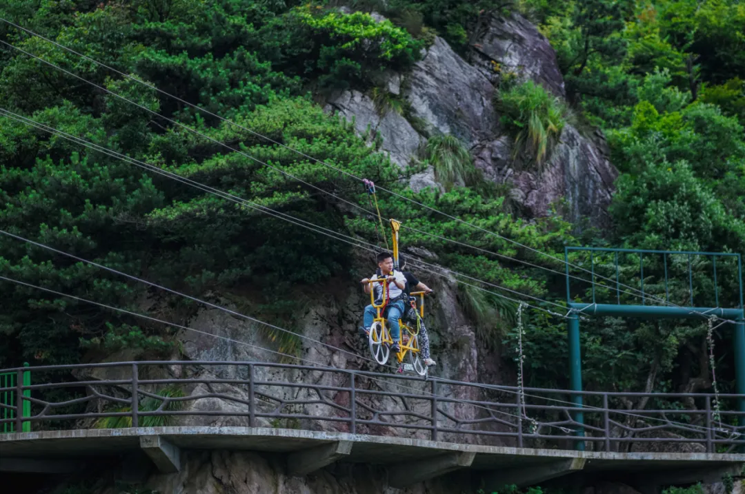 【云中索道】 斜长2466米,垂直落差807.5米,是浙北地区最长的客运索道群,沿途设立支架26座,设计运行速度6米每秒,每小时单向运量可达1500人。