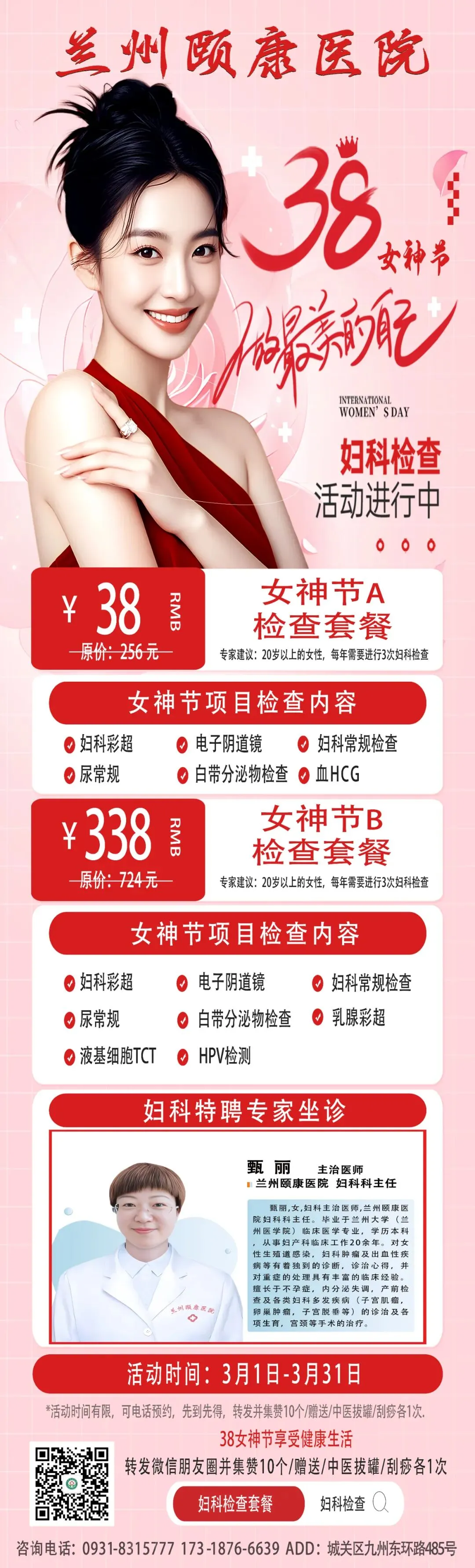 当前位置:首页>美女资讯>3・8 女神节 福利来袭 !《兰州颐康医院》 妇科健康检查套餐仅需38 元 ,呵护自己,从此刻开始.