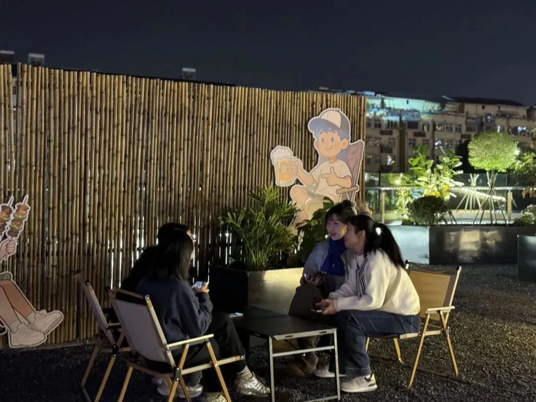 • 🎬 星空露天电影夜幕降临,串灯和建筑霓虹一起亮了围坐一团,氛围感直接拉满,捧着热咖啡,品着精致甜点,在星空下看一场治愈电影温柔又治愈,惬意又放松