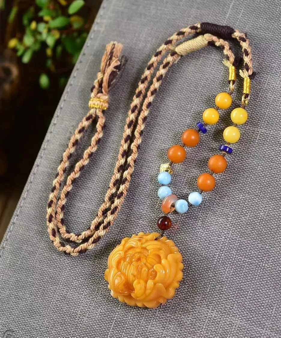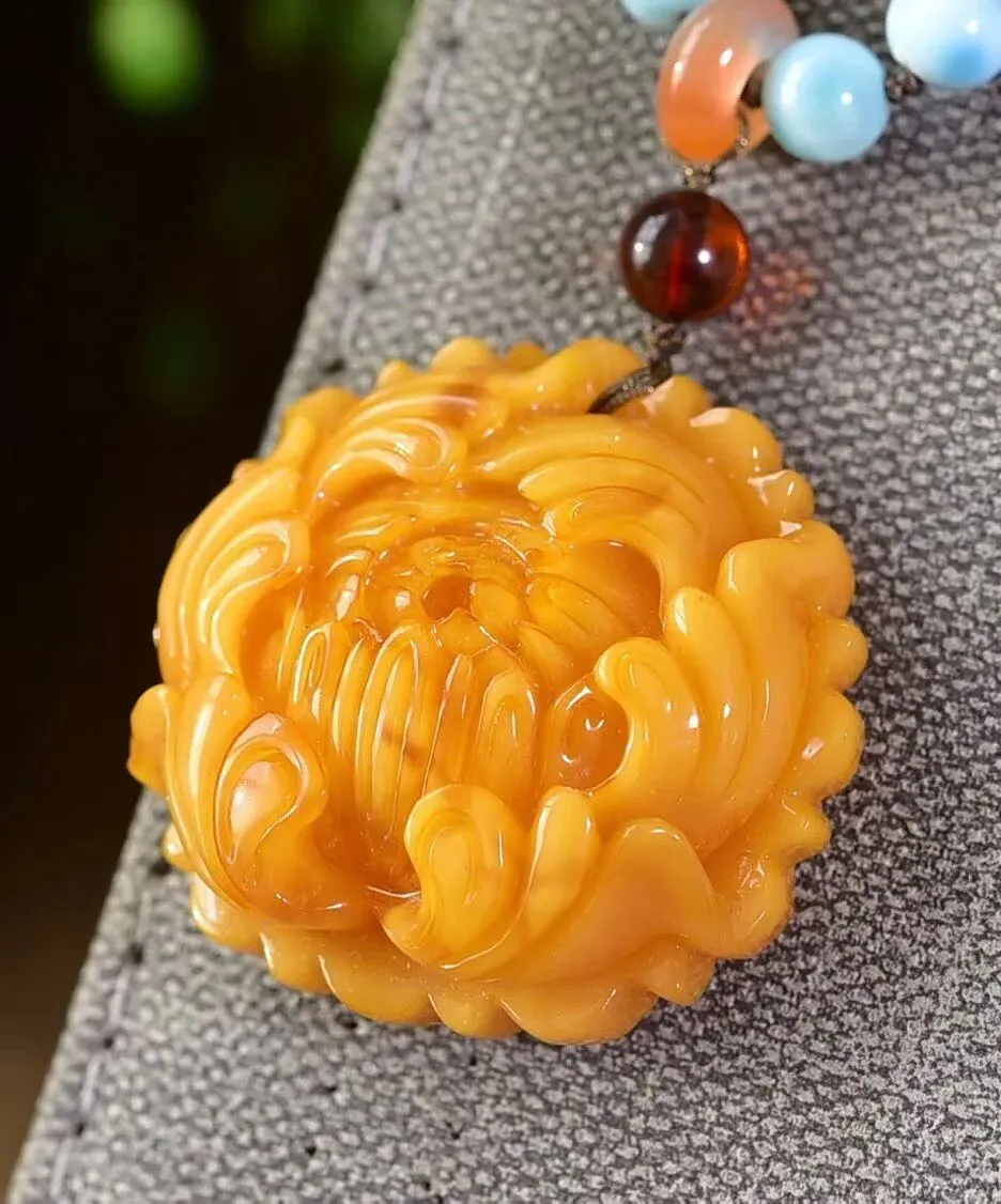 0227-2-1099、新品特惠🉐️7折一套!🔥🔥天然俄料蜜蜡牡丹花吊坠,圆润饱满,蜜满蜡实,满蜜枣红色妖花老蜡,坠重约10.8克,尺寸约35x33x16毫米,总重18.3克,配蜜蜡编织链,支持检测!这样蜡质和颜色的货已经不多啦,遇见请珍惜!