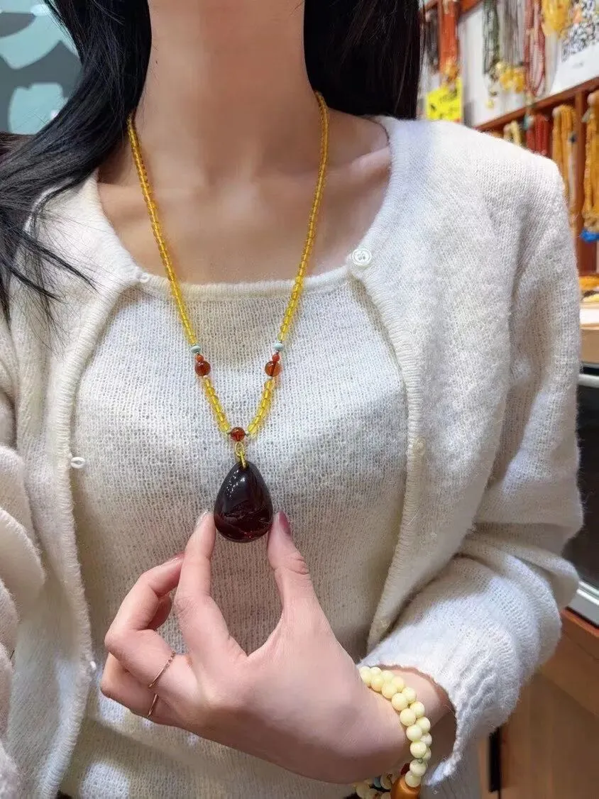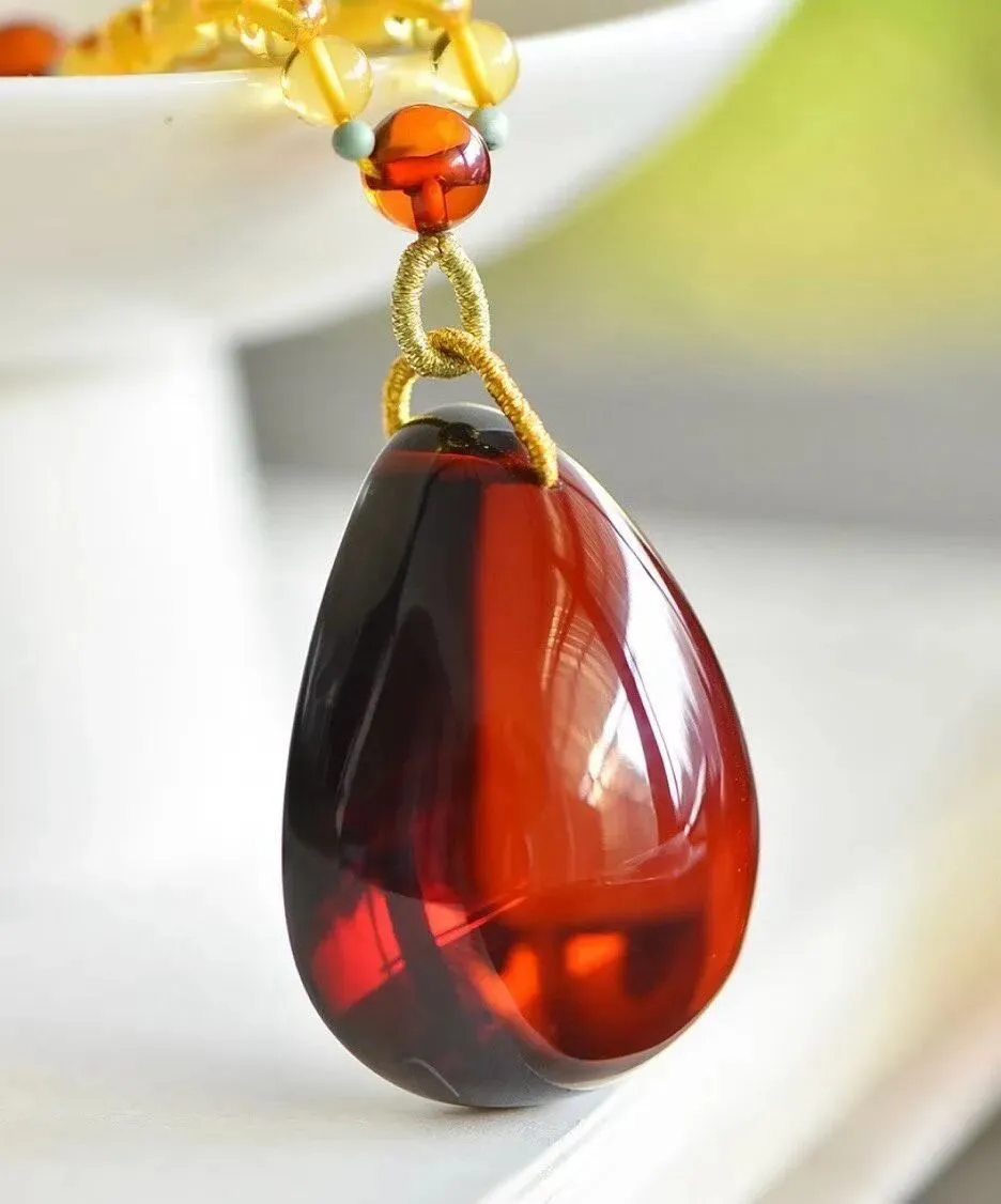 0227-8-1288、捡漏价🉐️6.5折一套!🔥🔥天然血珀水滴吊坠,颜色红润,圆润饱满,意境美,无杂裂,吊坠重约14.5克,尺寸约41x30x21毫米,总重约25.9克,送原创血珀链,支持检测!!