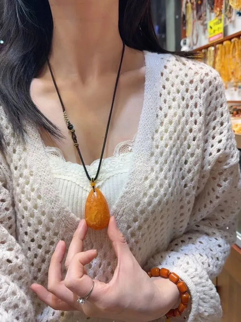0227-15-1338、新货到🉐️6.2折一条!🔥🔥🔥天然俄料妖花老花蜡水滴吊坠,圆润饱满,蜜满蜡实,满蜜鸡油红老蜡,吊坠重15.4克,尺寸约50x40x21毫米,总重约37.7克,送南红手工链,支持检测