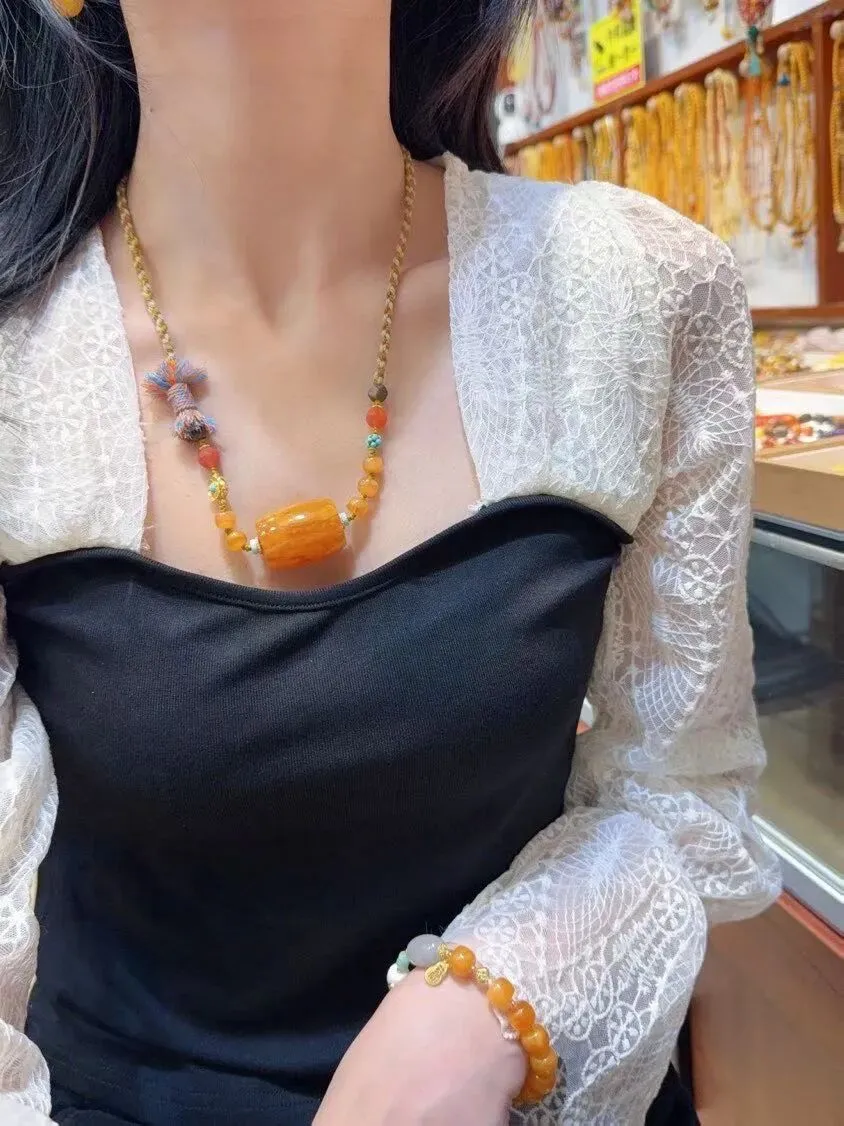 0227-16-1638、新货到🉐️7折一条!🔥🔥🔥天然老花蜡桶珠锁骨链项链,圆润饱满,蜜满蜡实,满蜜鸡油红老蜡,尺寸约31x24毫米,总重约21.3克,送蜜蜡手工链,支持检测