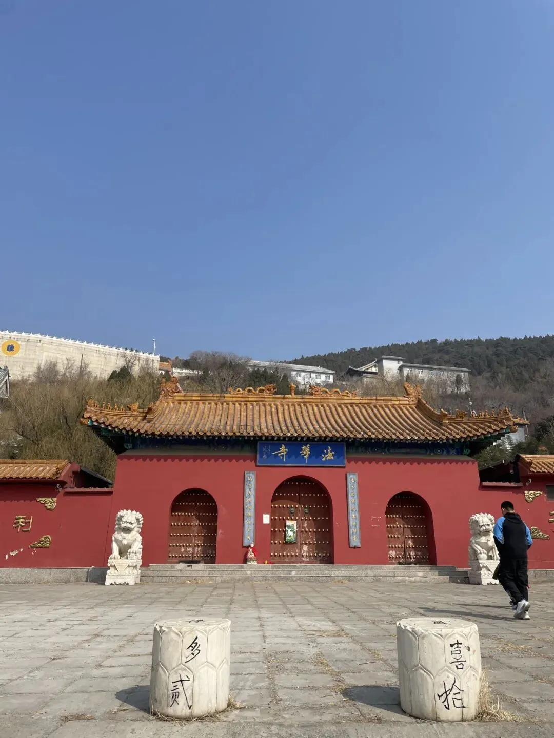 法华寺,位于天津市蓟州区桃花寺村。《蓟州志》记载:“桃花山在州东十八里,上有桃花,放时较它处先得,故此得名。有刹名桃花寺,始建于唐。抗战时期,这座千年古寺毁于侵华日军之手。复建后改名“法华寺”,红墙黄瓦,宝相庄严,颇有气势。