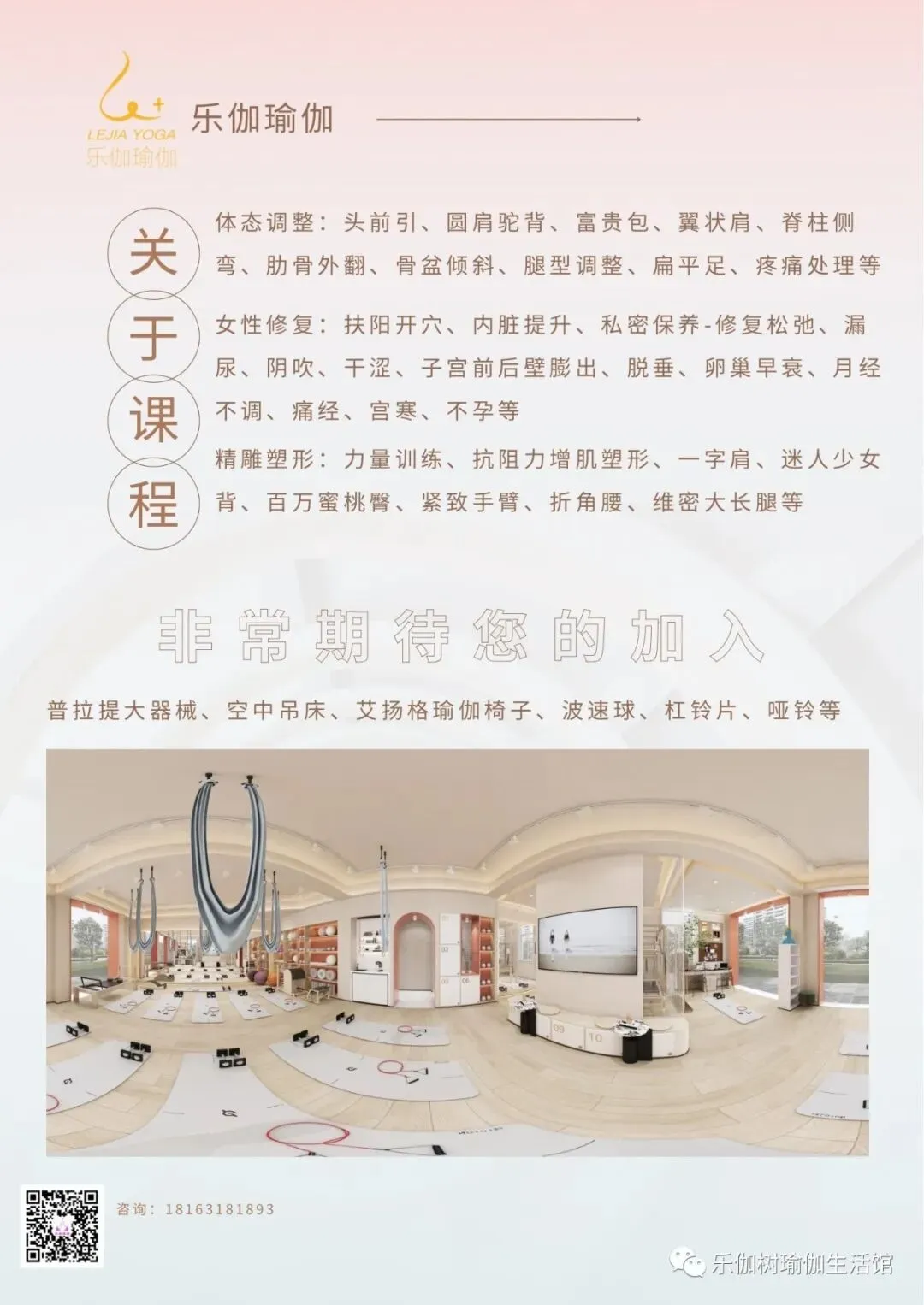 丰富课程体系:乐伽始终坚持原创,独创自己的课程体系,拥有六维三阶三效精准形体抗衰系统,通过体态调整,产后修复,定制曲线三种方式,作用于您的骨骼,筋膜和肌肉层,一站式帮您管理形体痛症机能从而帮您达到冻龄减龄逆龄的效果,最终帮您实现形体优美化,身体健康化