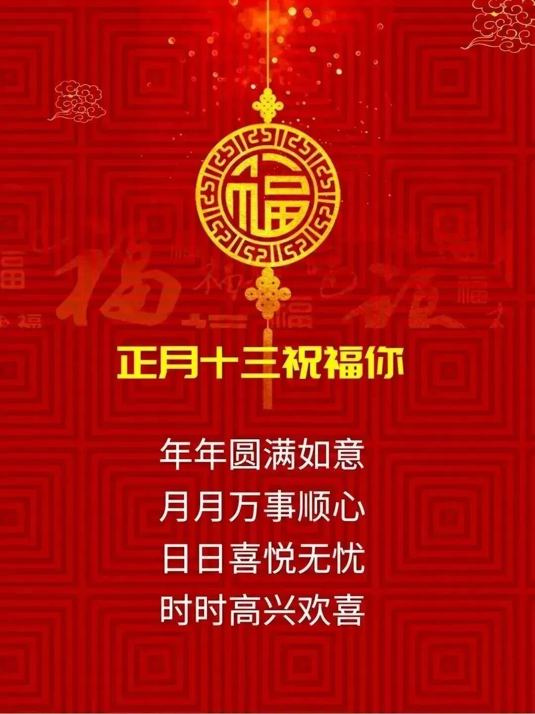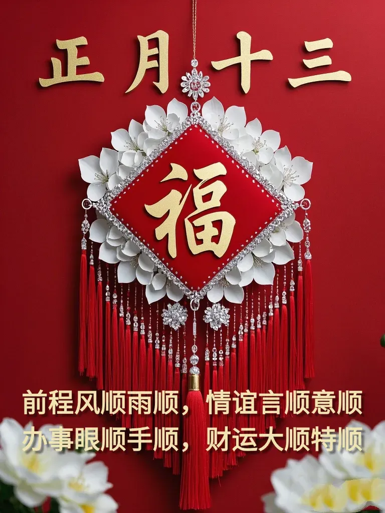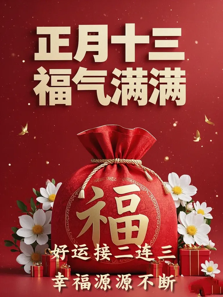 正月十三福门开,接二连三喜事来。带着祝福过新年,愿你新年多赚钱。事事如意心更顺,好运不断喜事连。祝你全家健康平安,幸福长寿,从此富贵吉祥行大运,身体健康万万年!
