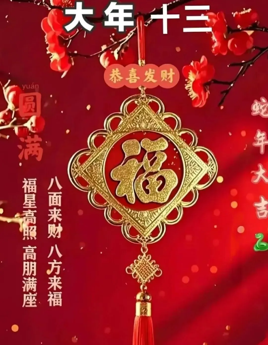 大年十三送你大元宝💰,财源滚滚往家跑;年送你福满多,合家幸福好运来;年送你红棉袄,身上暖暖心里欢😄;年得到祝福多,一年顺心万事和🙌!