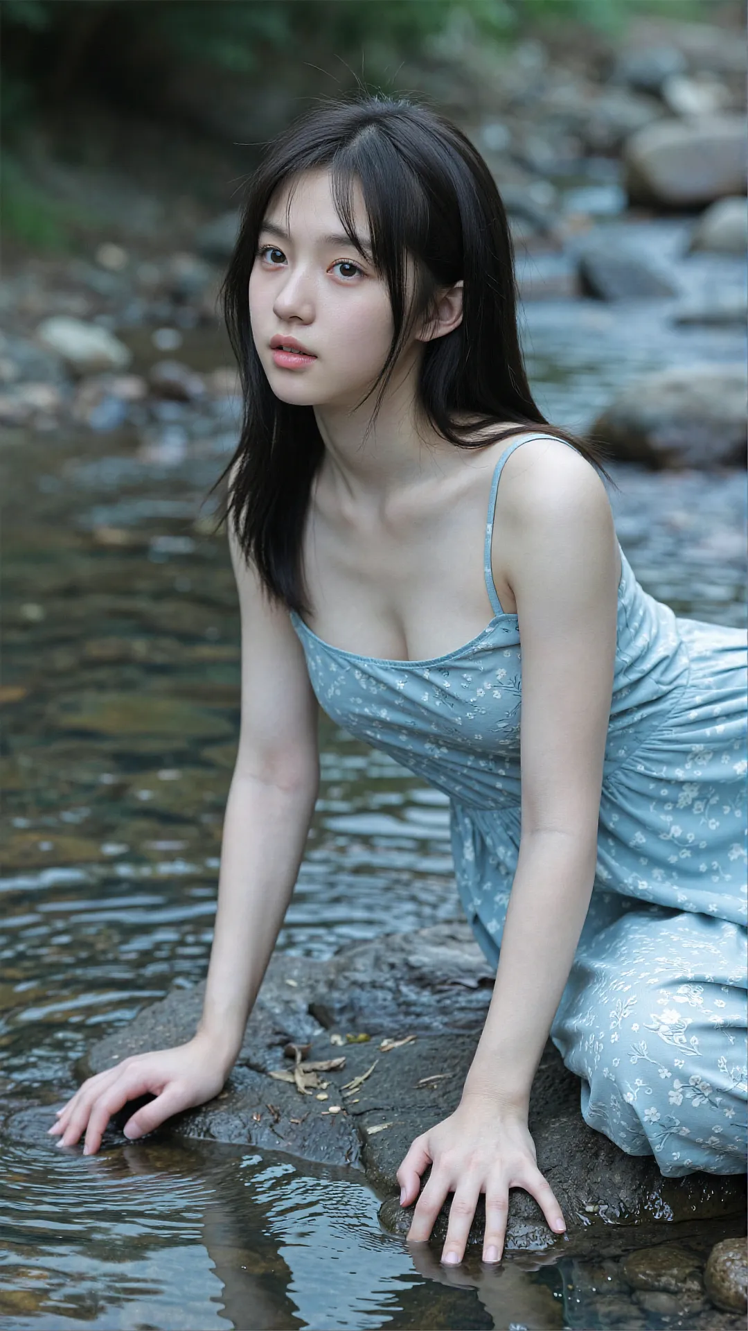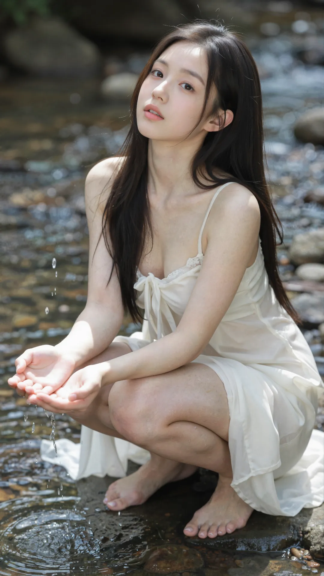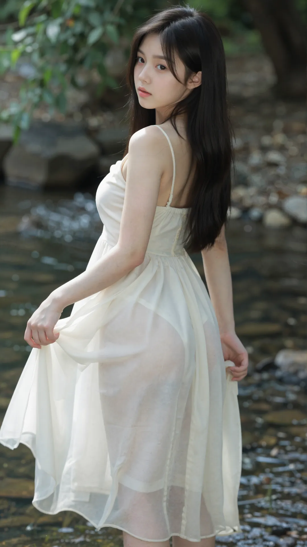 清浅溪涧穿林而过,碎玉般的水声揉碎了夏日的燥热。少女伫立在微凉的溪水中,墨色长发被微风拂起,几缕贴在光洁的颈侧,眉眼清秀利落,无半分稚嫩圆润,却藏着 16 岁独有的清澈灵动。