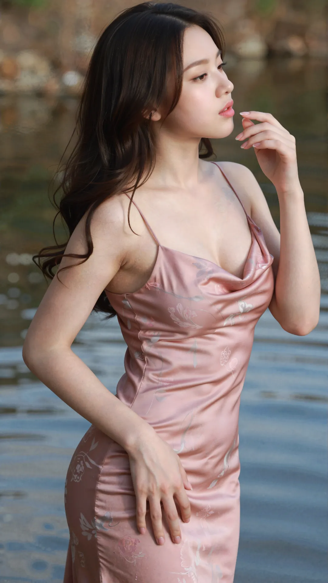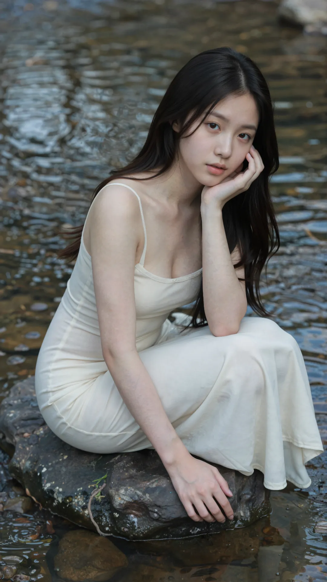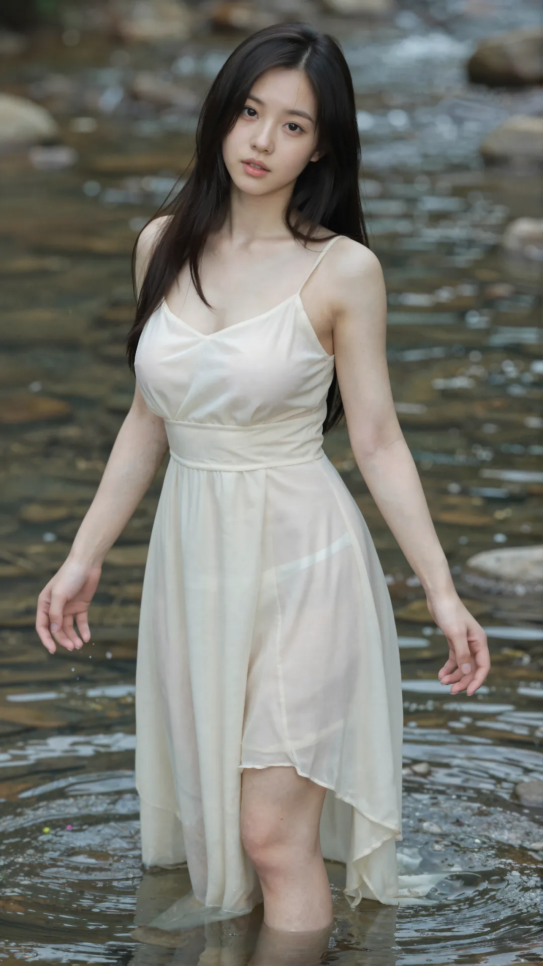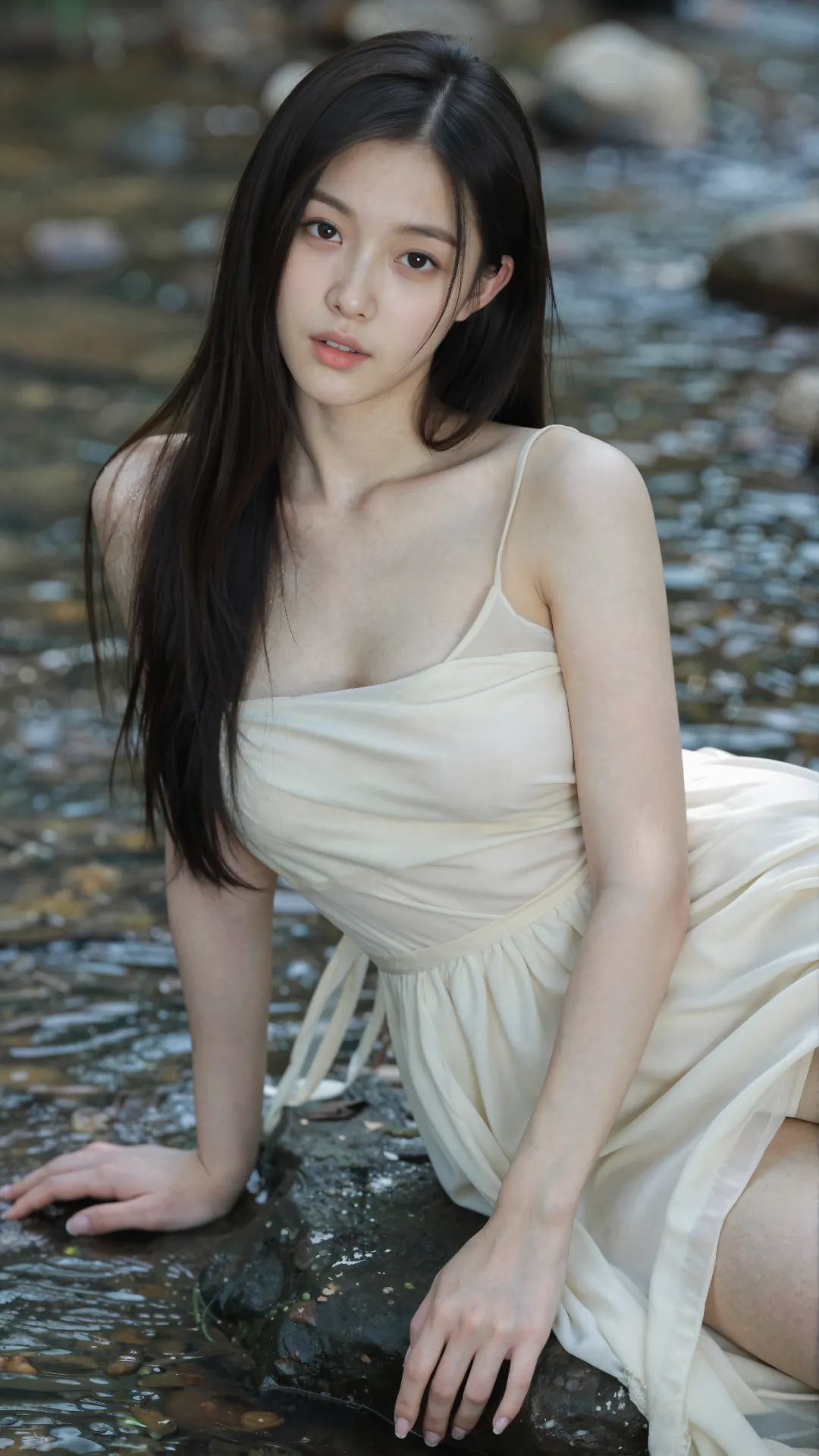 清浅溪涧穿林而过,碎玉般的水声揉碎了夏日的燥热。少女伫立在微凉的溪水中,墨色长发被微风拂起,几缕贴在光洁的颈侧,眉眼清秀利落,无半分稚嫩圆润,却藏着 16 岁独有的清澈灵动。