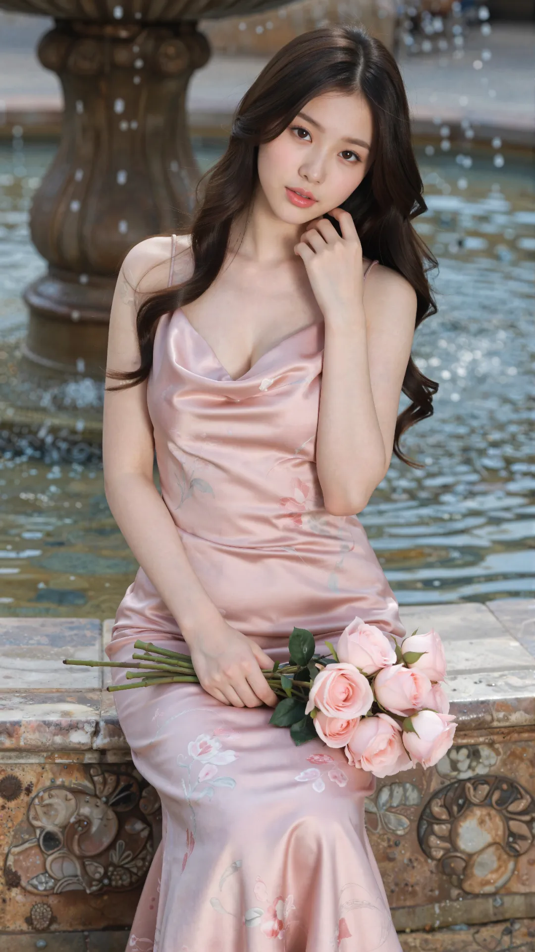 欧式喷泉旁,少女身着粉缎印花吊带鱼尾裙,缎面光泽衬得肌肤莹润。修身剪裁勾勒出挺拔曲线与曼妙身姿,长卷发垂落肩头,眉眼清秀,气质温婉又明艳。水流潺潺,繁花作衬,她静立的模样,宛如古堡花园里走出的优雅公主。