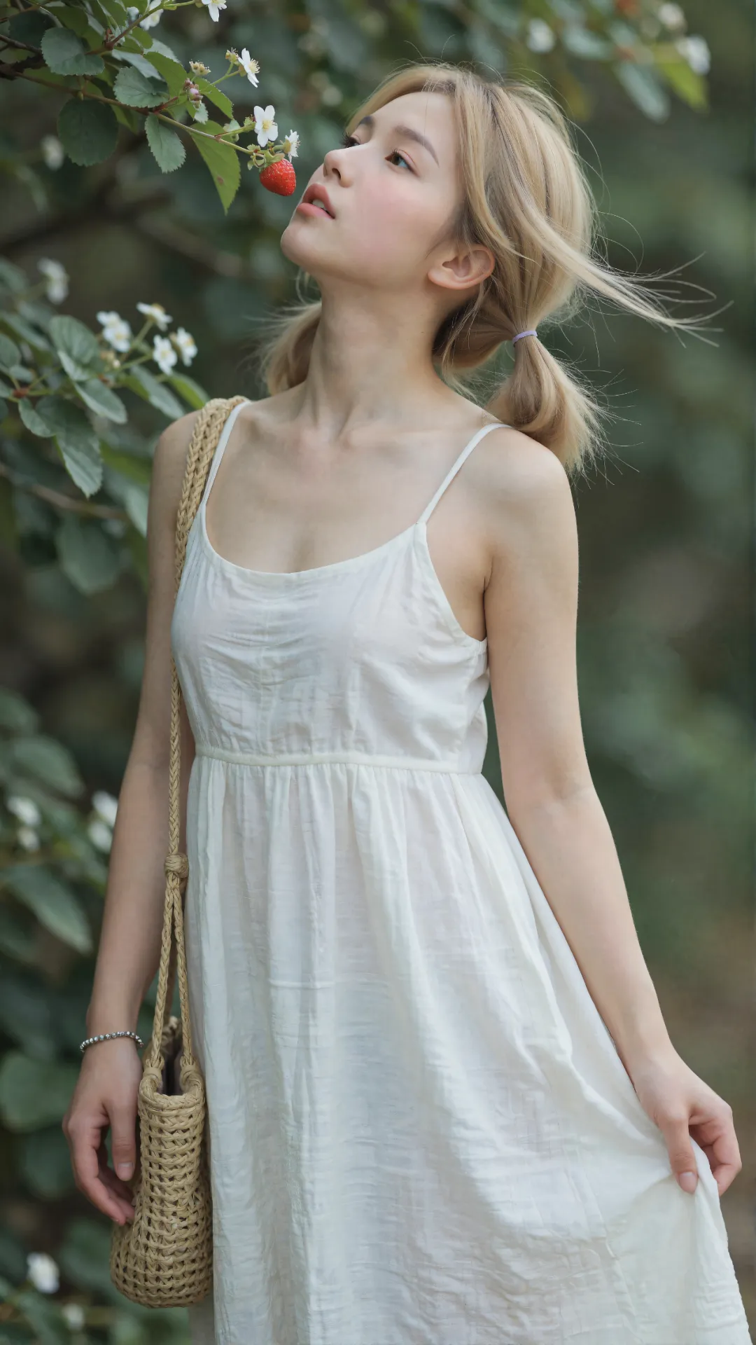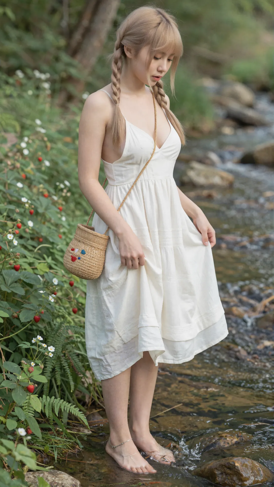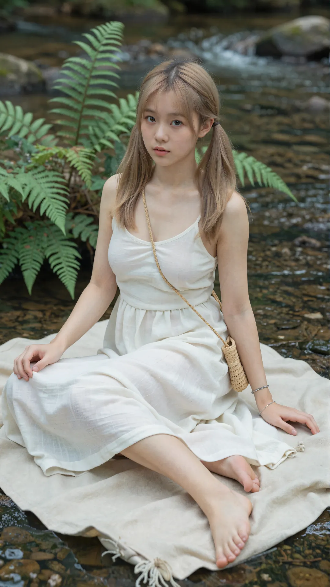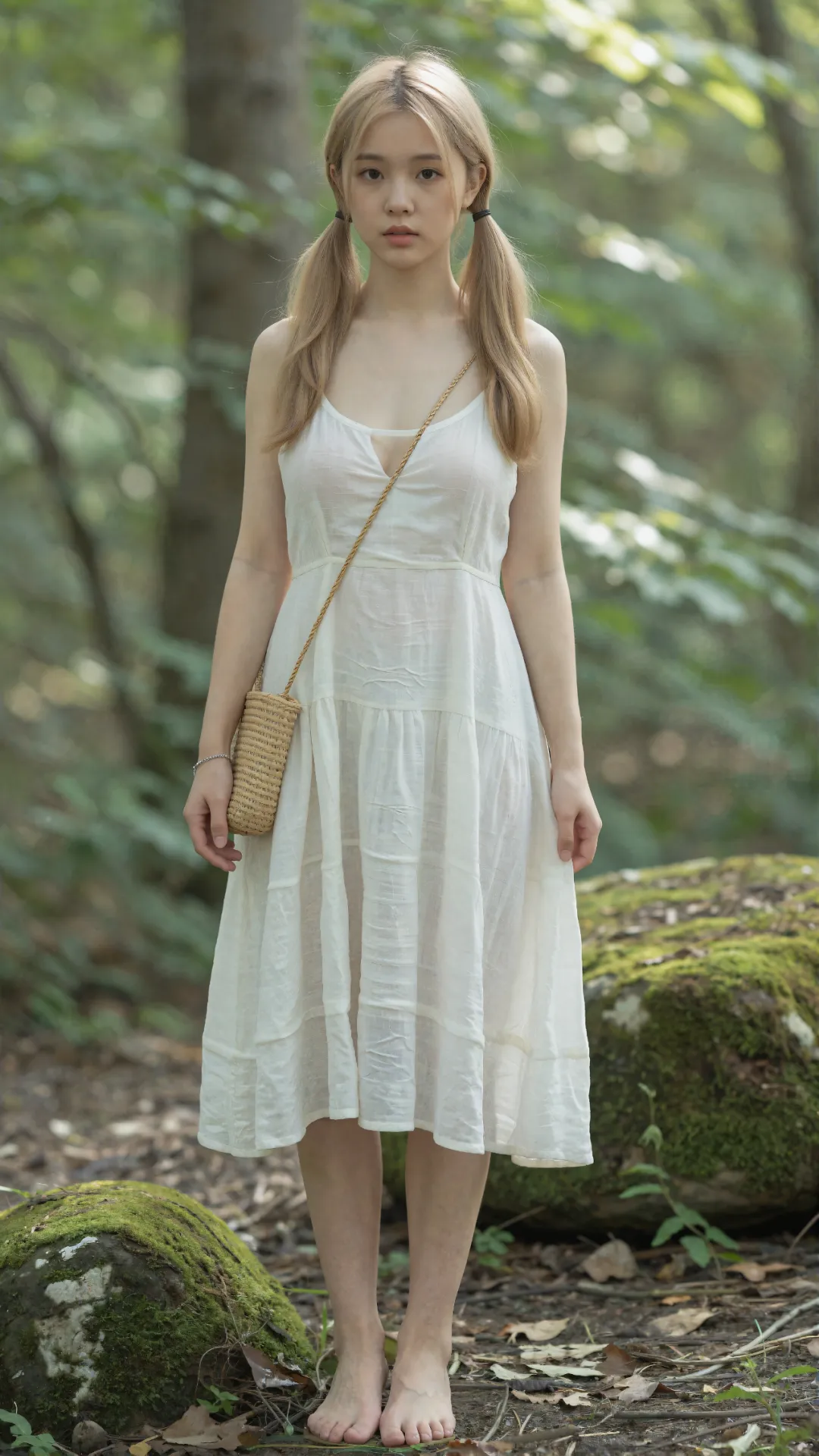 葱郁密林间,阳光揉碎在枝叶间,洒下斑驳光影。少女赤脚站在覆满青苔的青石旁,浅金色双马尾垂落肩头,发梢轻晃,自带灵动俏皮的青春气息。
