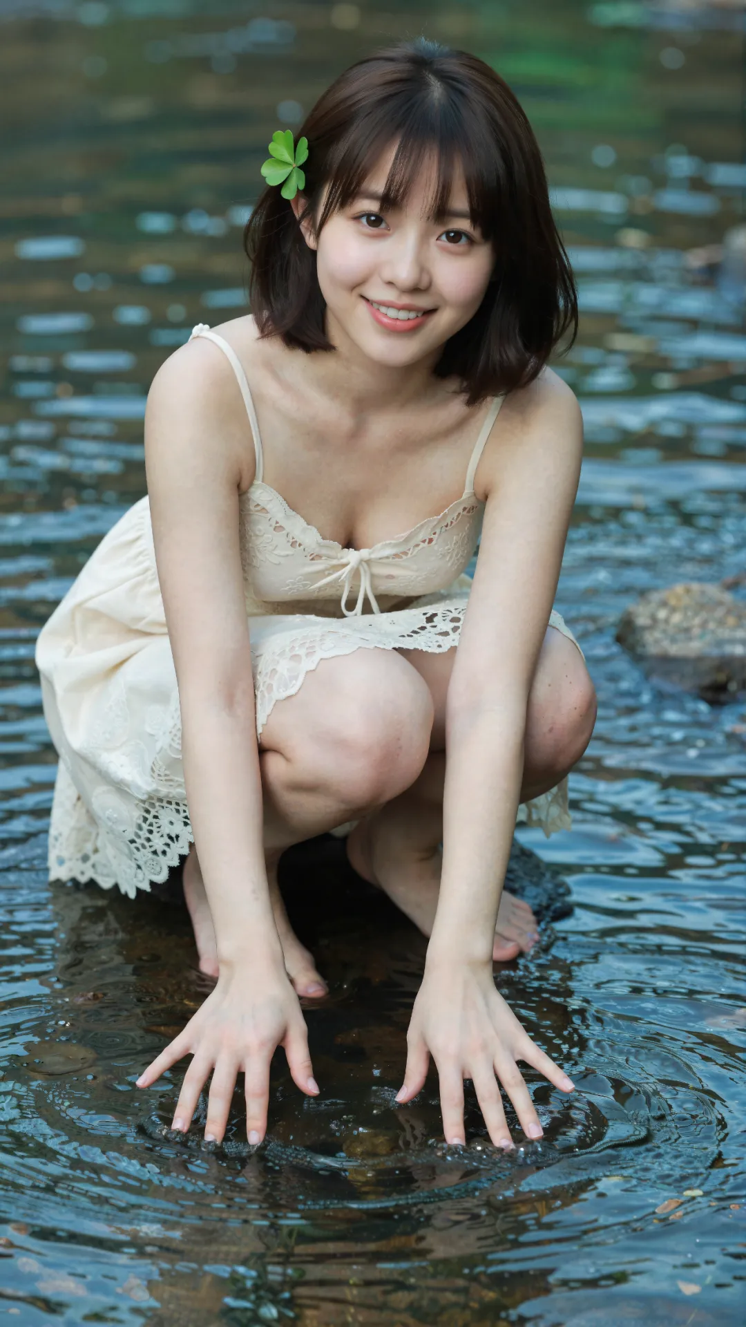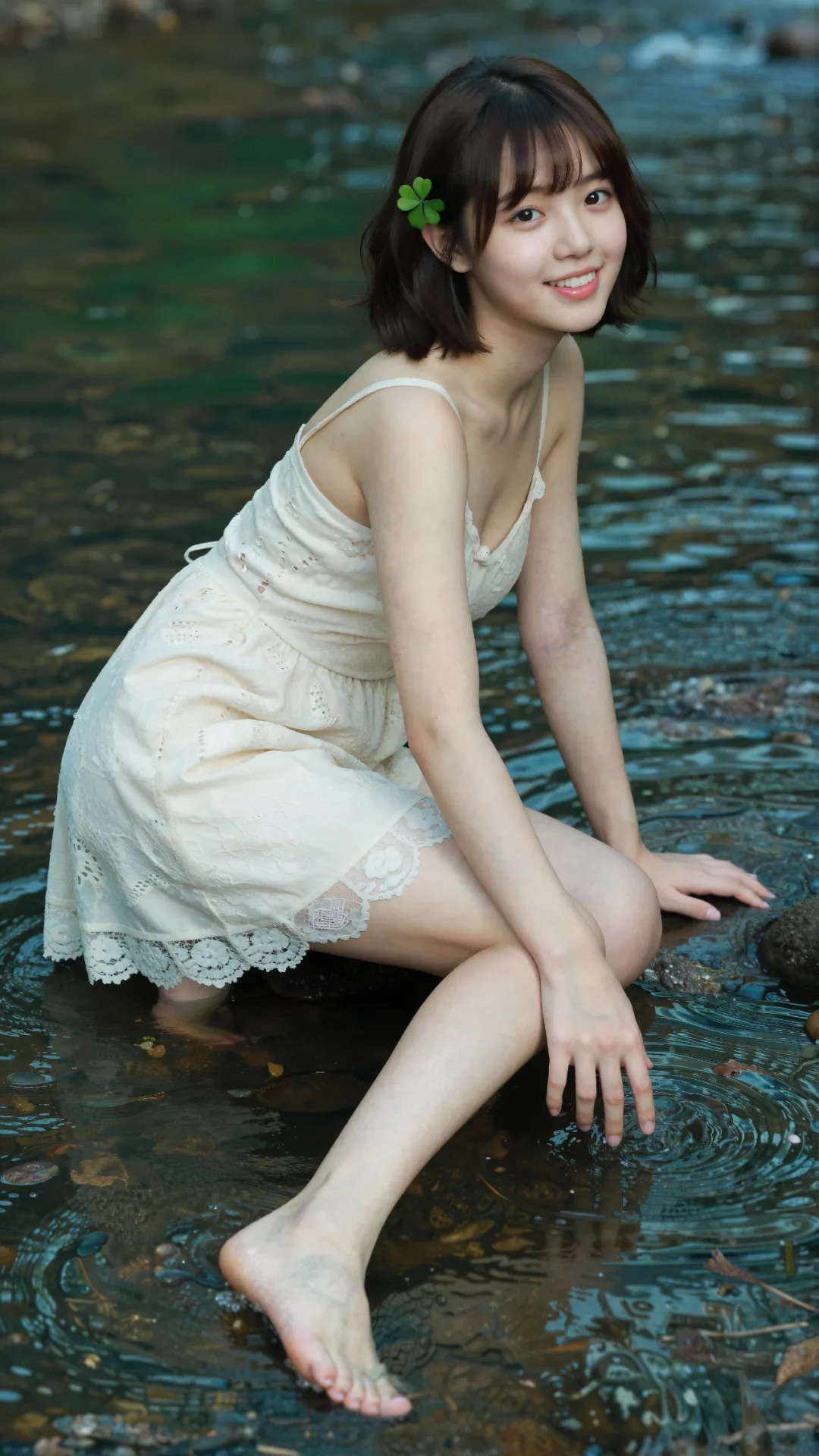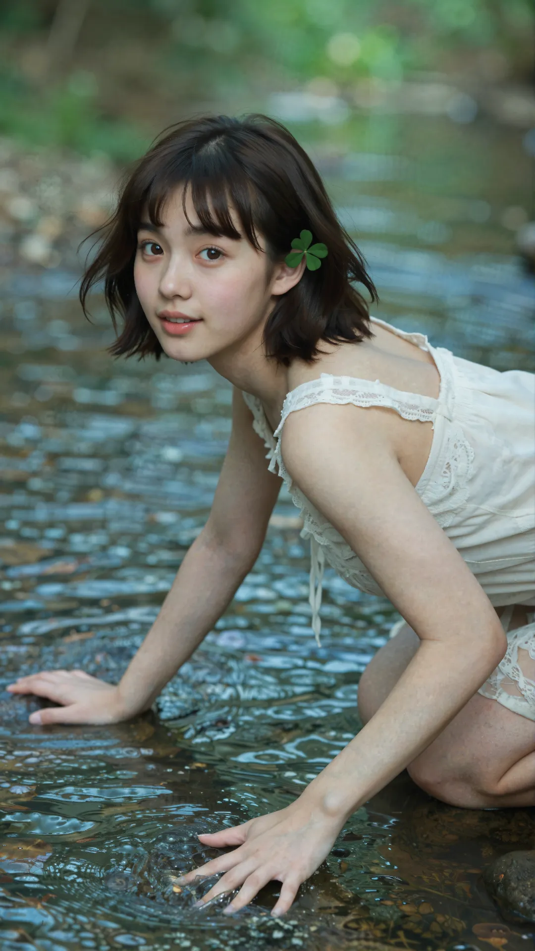 清浅溪涧旁,少女屈膝蹲在微凉的水流中,栗色短发搭配空气刘海,发间别着的四叶草,为画面缀上一抹灵动绿意。她唇角扬起明媚弧度,笑意澄澈又鲜活,将 16 岁少女的清甜与朝气尽数释放。