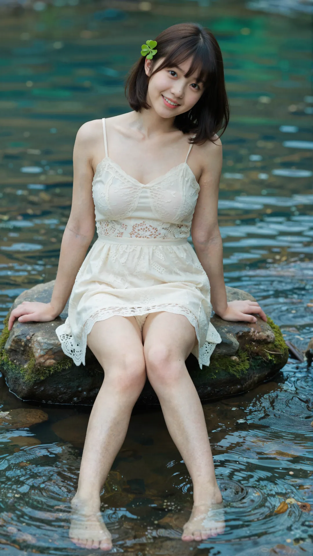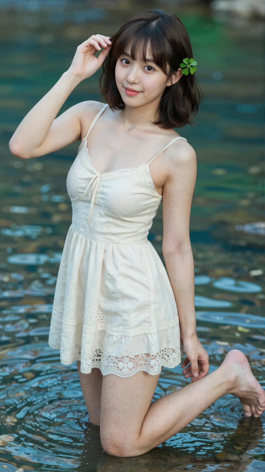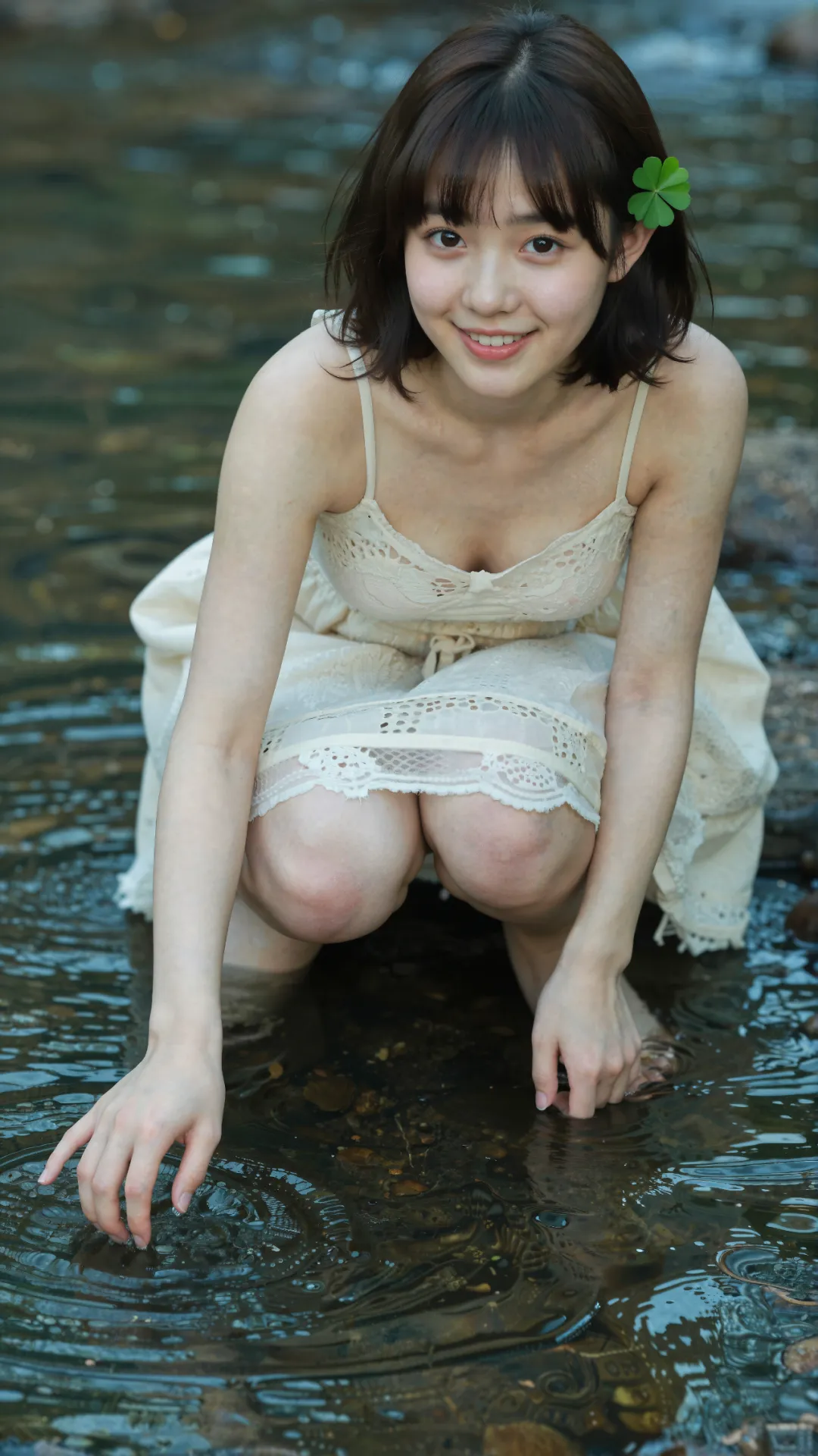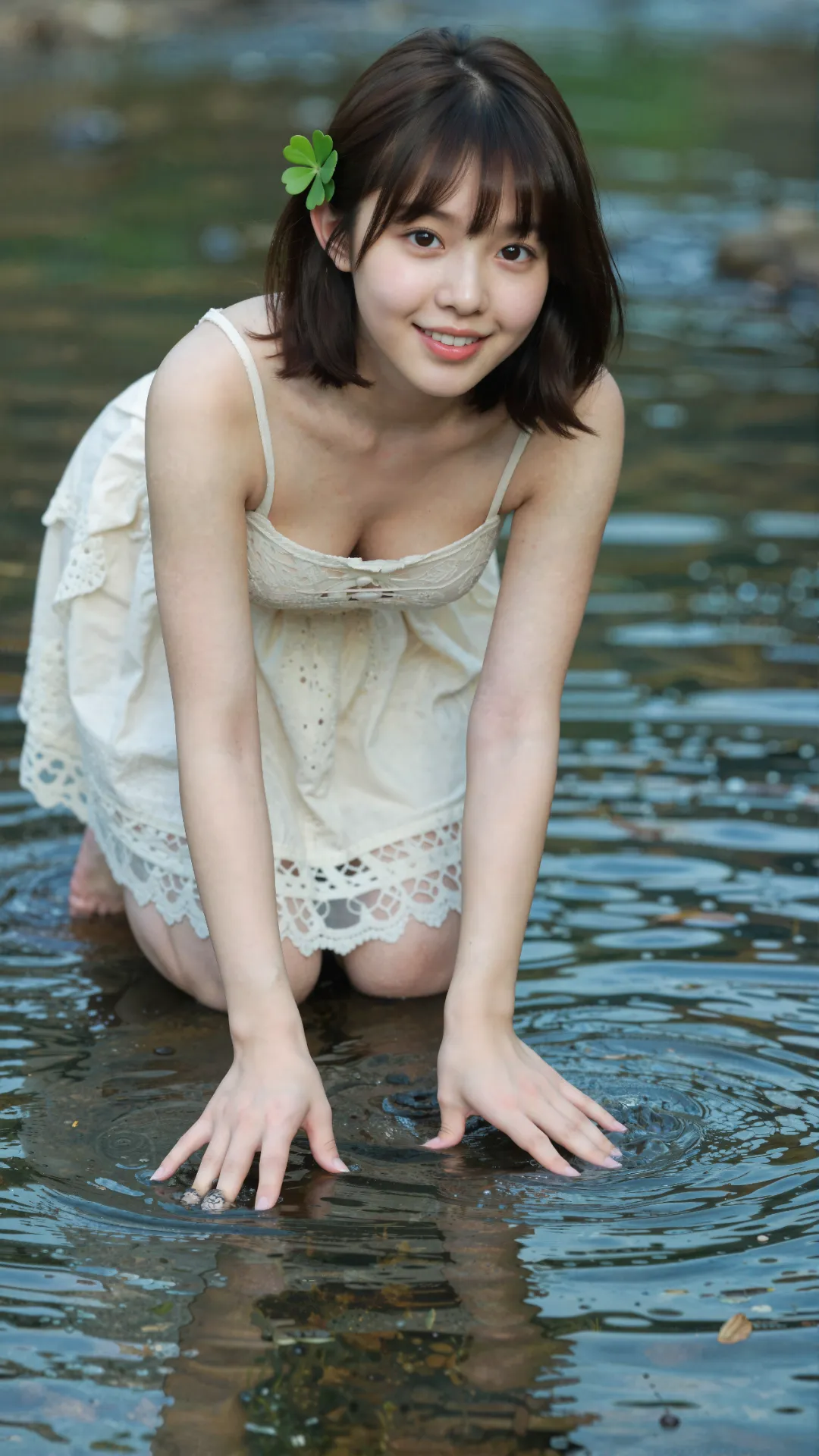 清浅溪涧旁,少女屈膝蹲在微凉的水流中,栗色短发搭配空气刘海,发间别着的四叶草,为画面缀上一抹灵动绿意。她唇角扬起明媚弧度,笑意澄澈又鲜活,将 16 岁少女的清甜与朝气尽数释放。