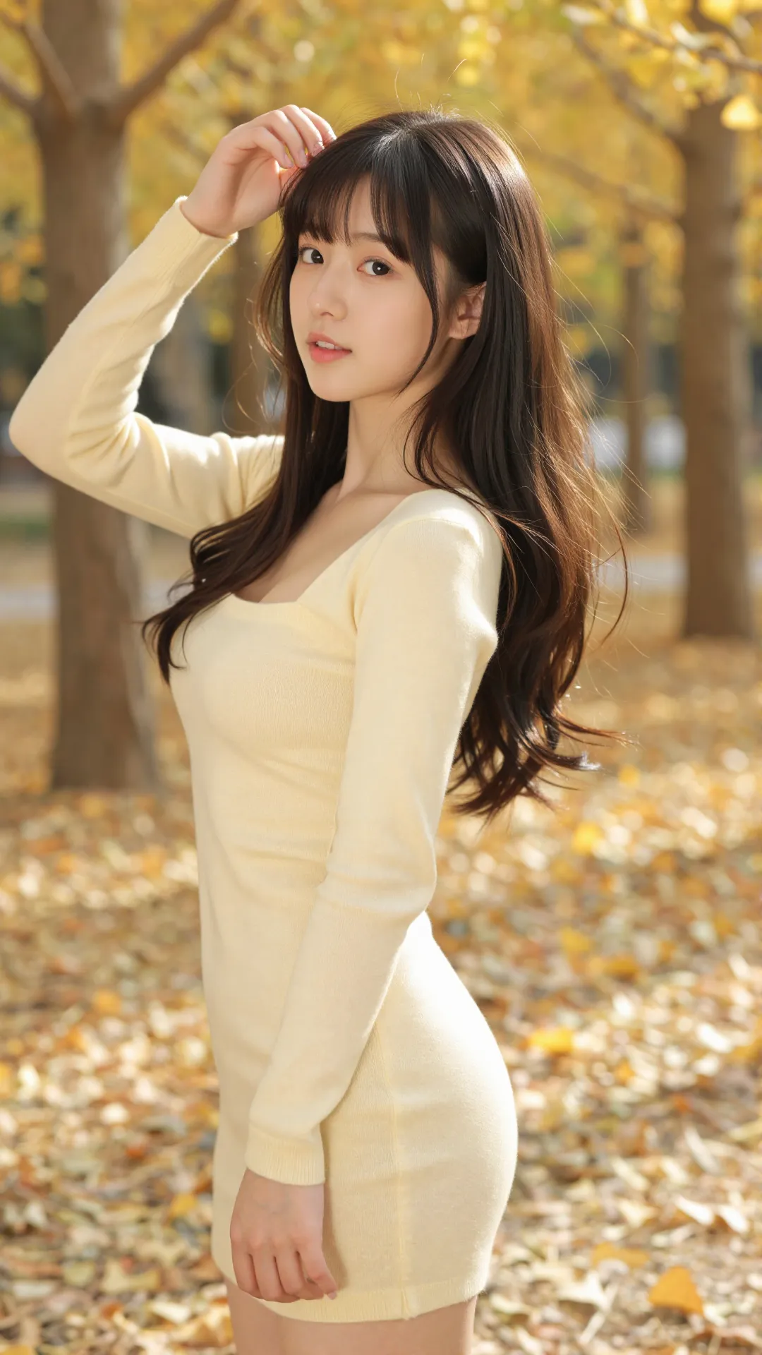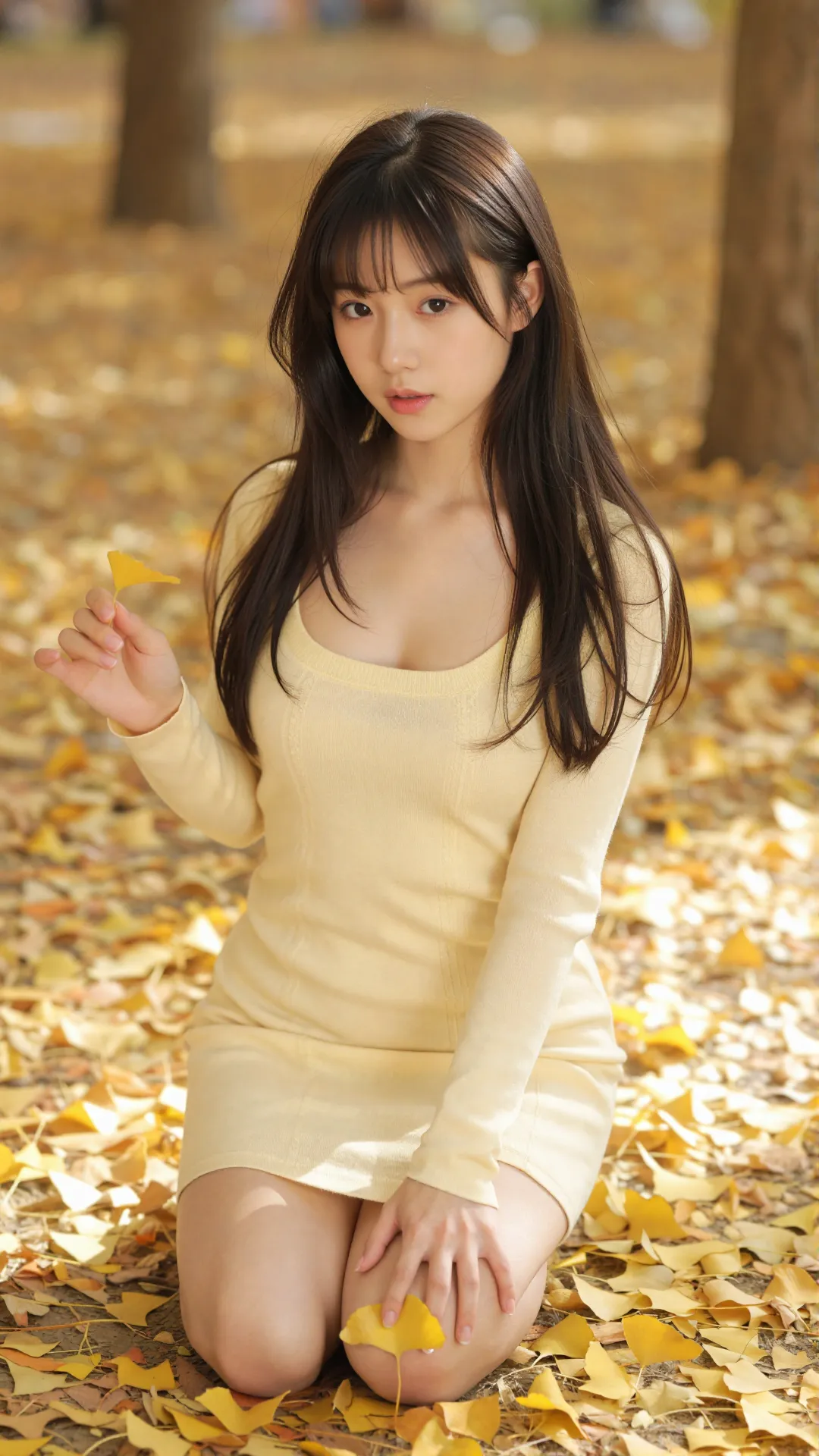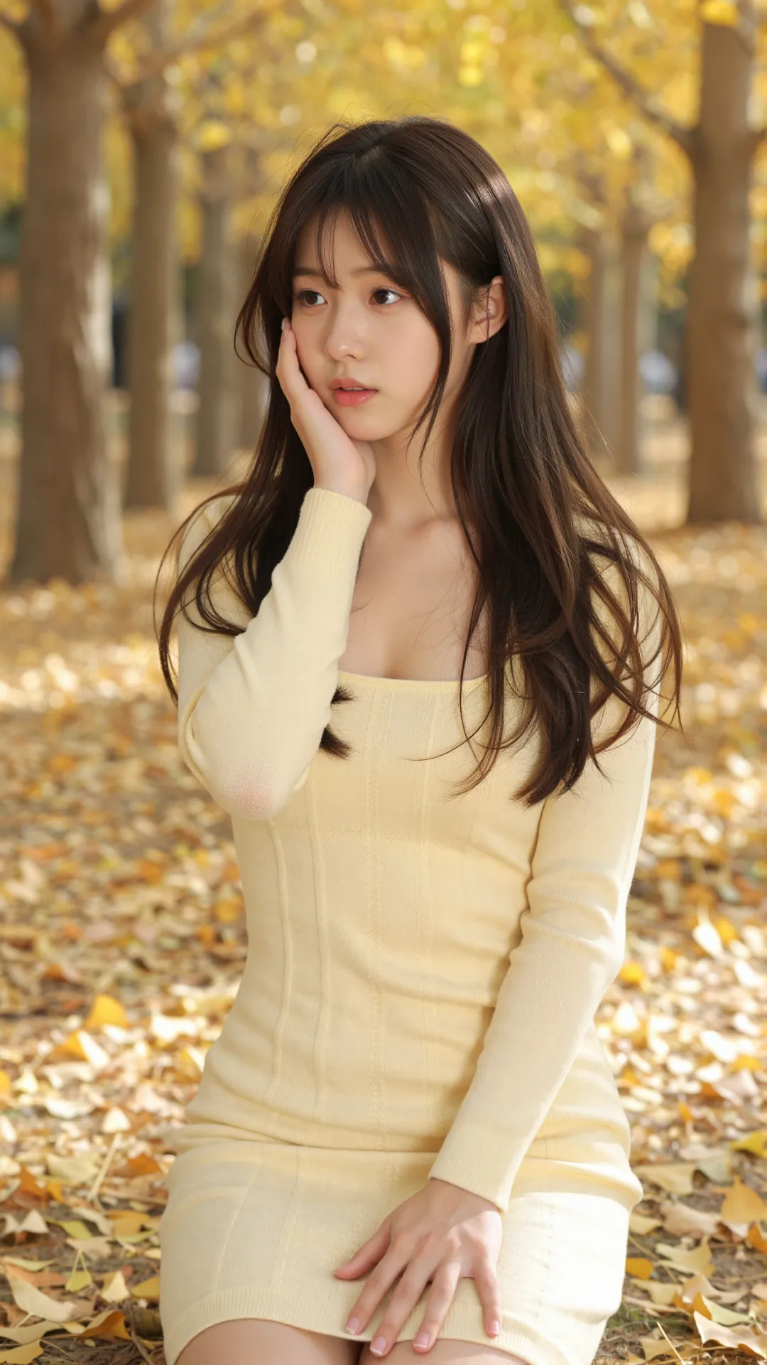 秋日银杏林间,少女身着暖黄针织方领裙,柔化了秋的清冽。她侧身而坐,指尖轻触脸颊,眉眼低垂,笑意温柔。满地金叶为她铺就温柔底色,暖光裹着她的轮廓,将青春的甜软与秋的诗意揉成了一幅治愈画卷。