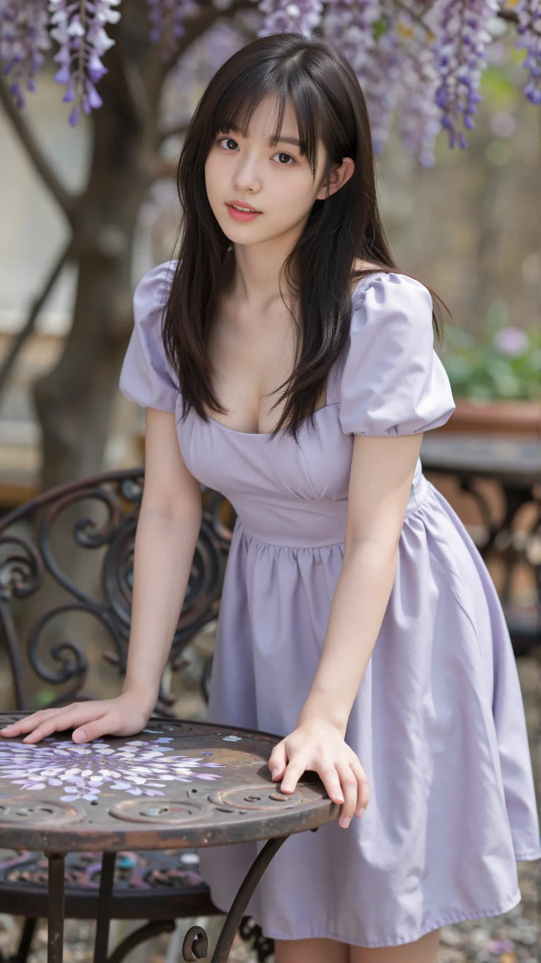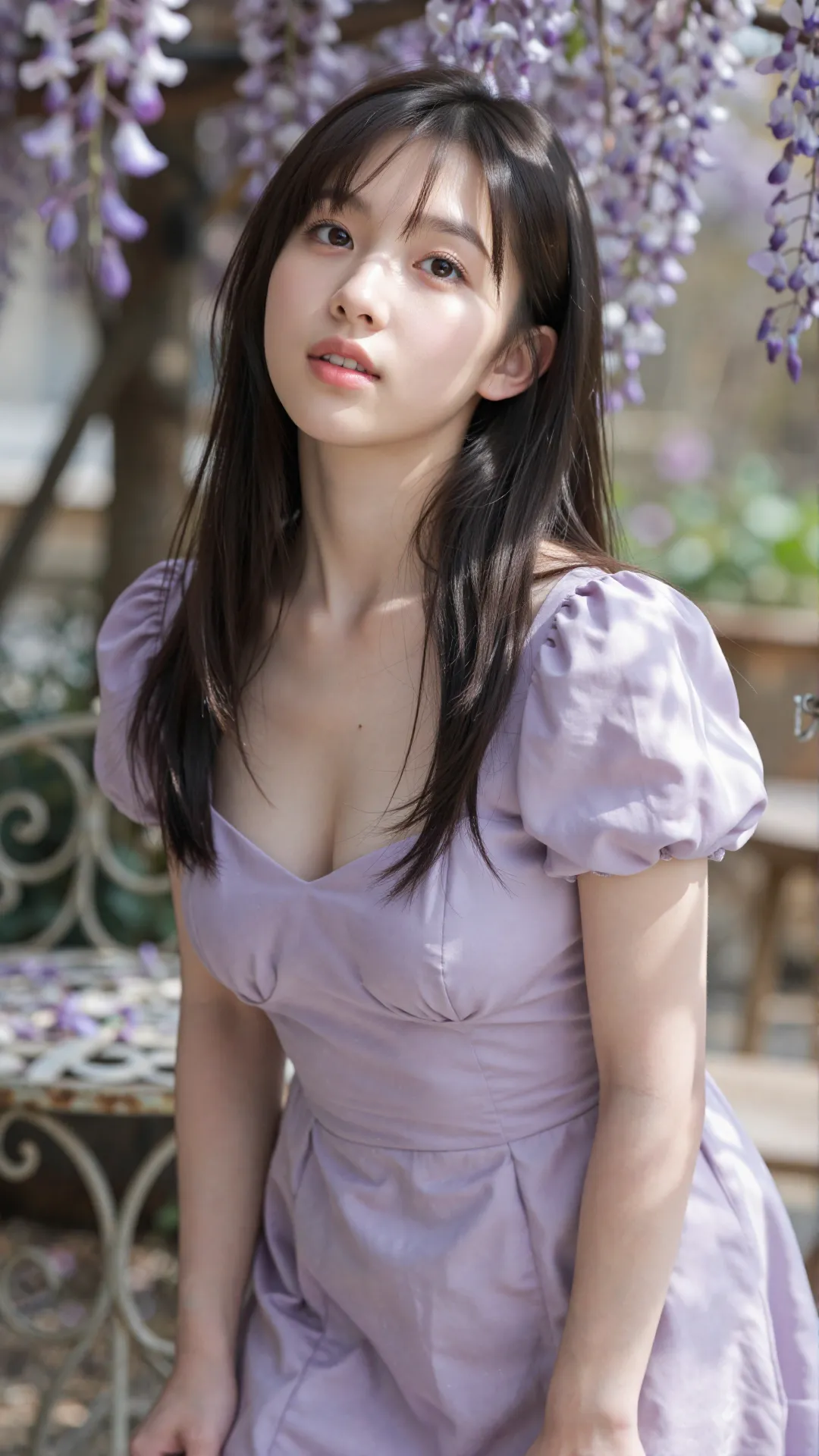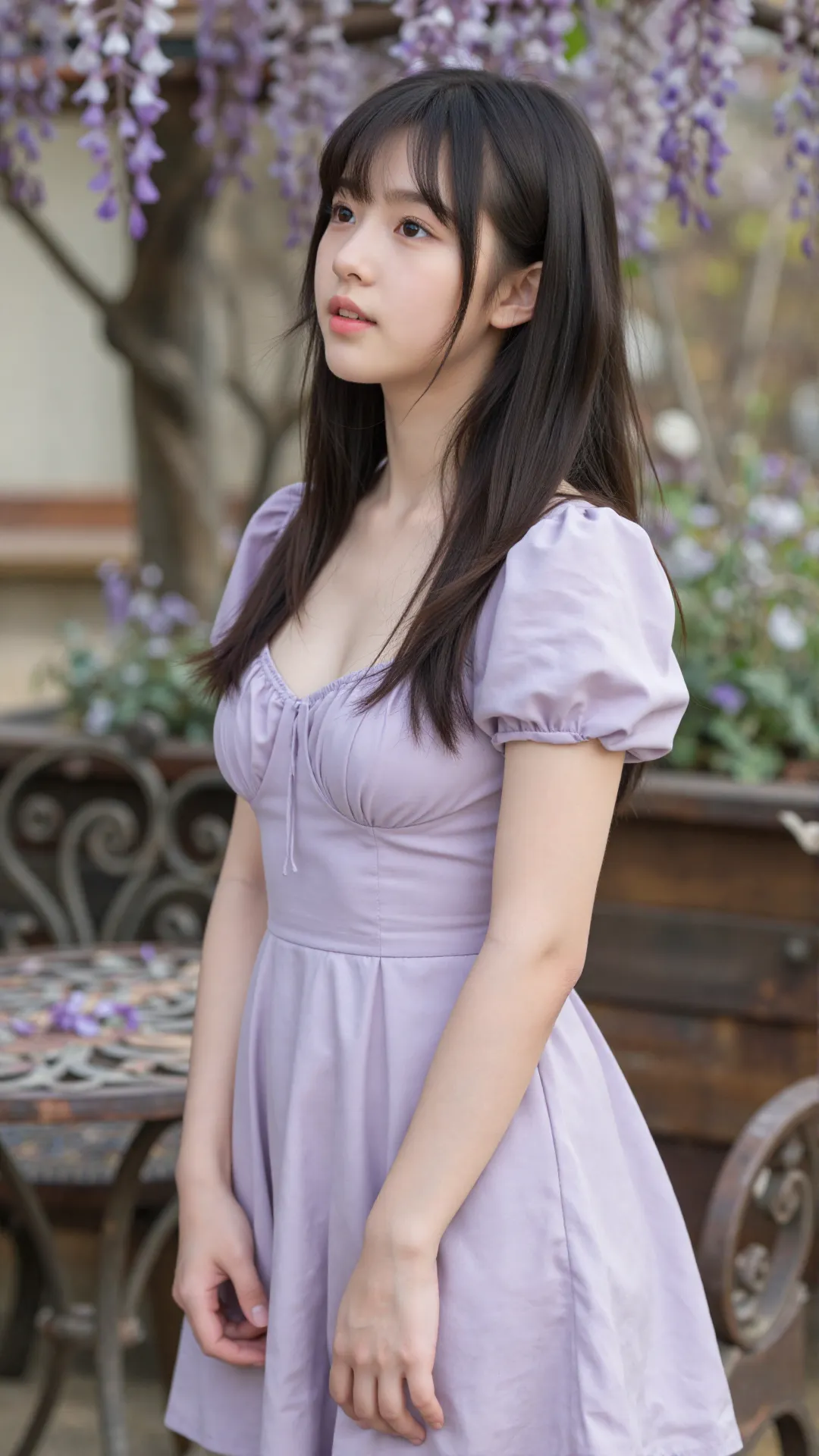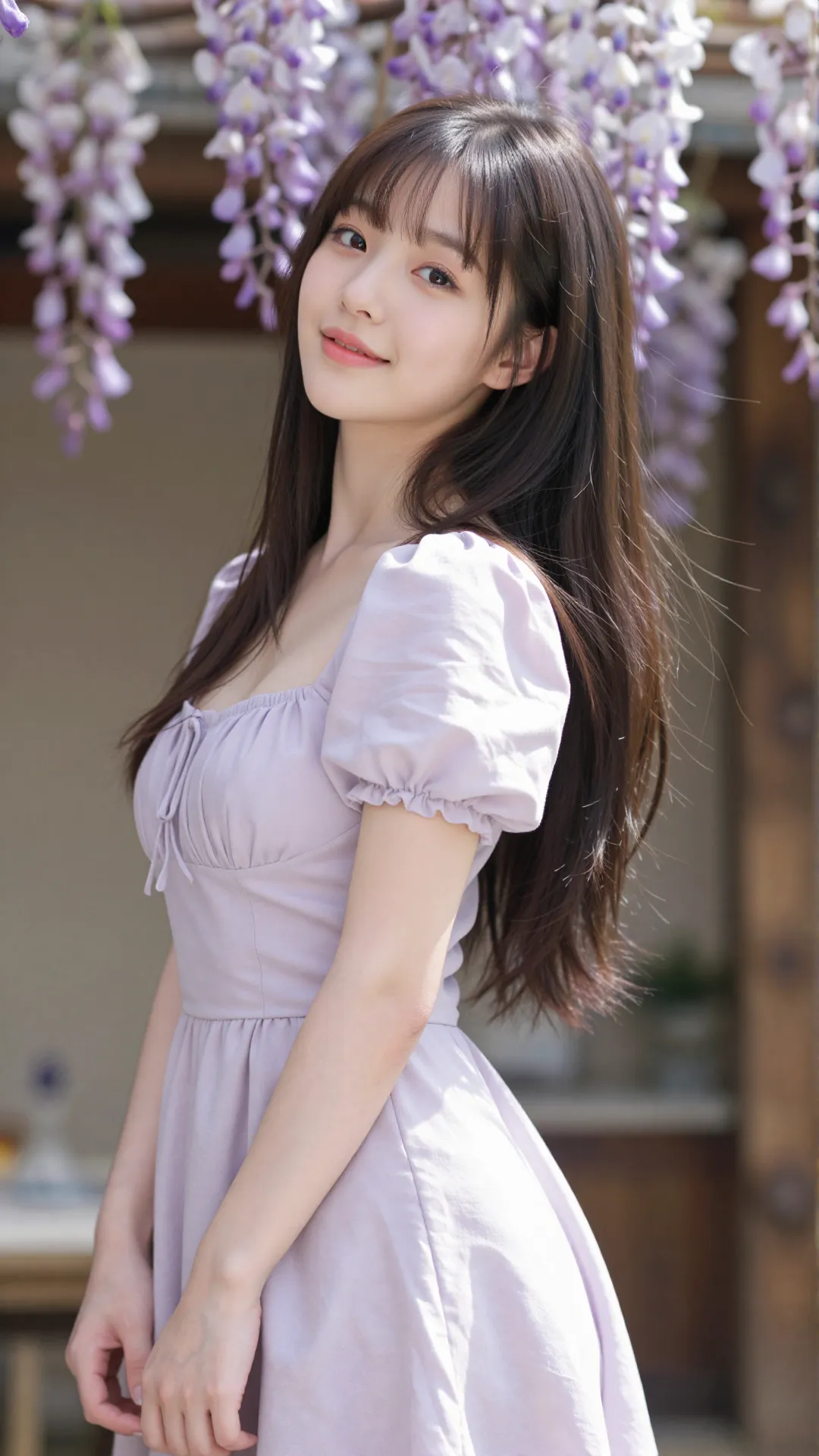 紫藤花瀑垂落肩头,淡紫花瓣轻拂过她的发梢。少女身着同色系泡泡袖连衣裙,方领设计勾勒出柔美的肩颈线条,与挺拔的身形相得益彰。她抬眸凝望,眼神清澈又带着一丝慵懒,仿佛将整个春日的温柔都藏进了眼底。