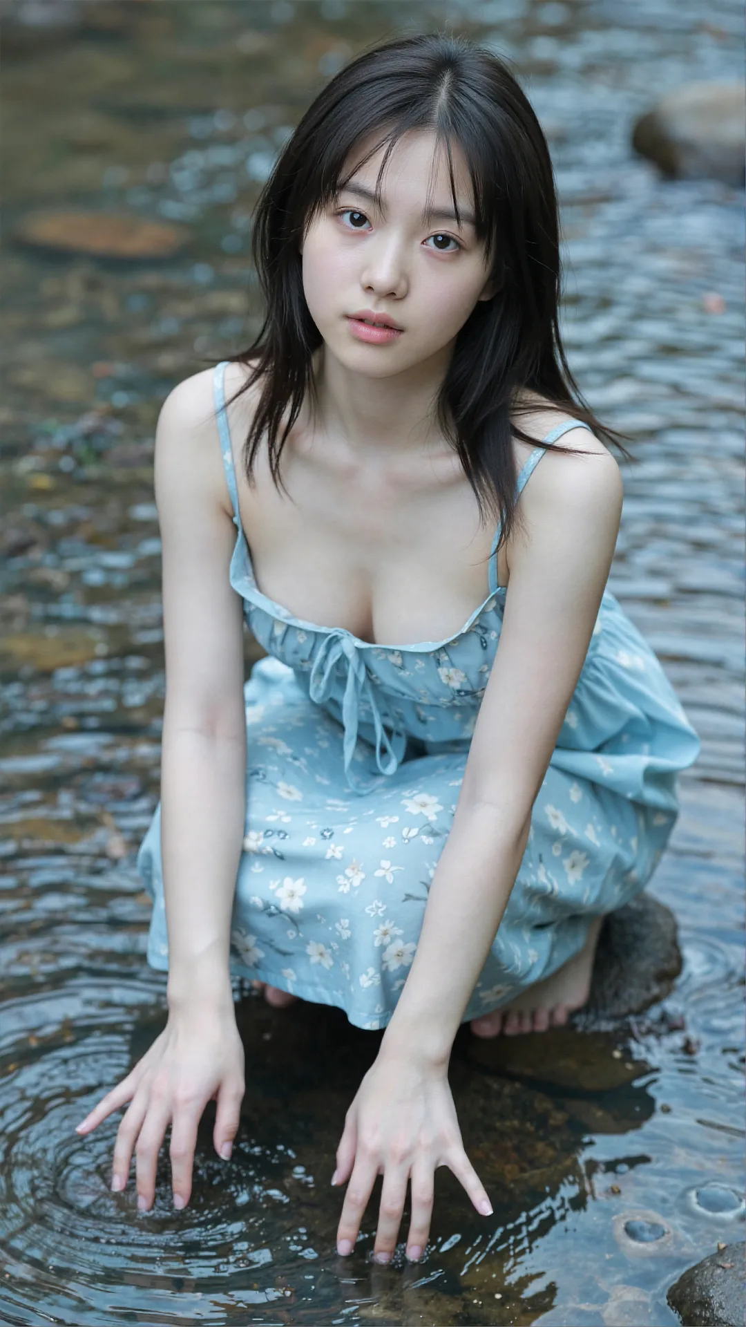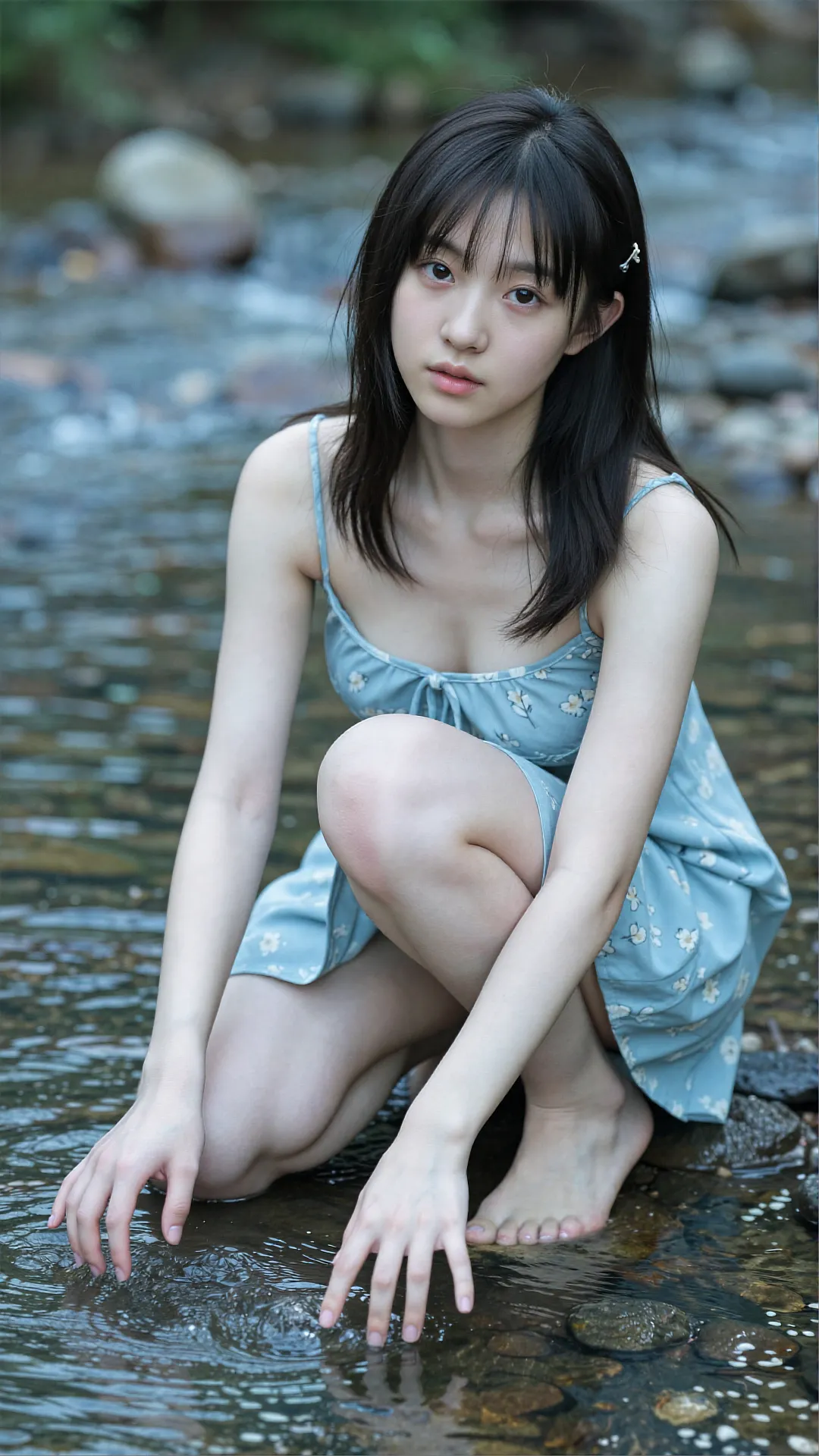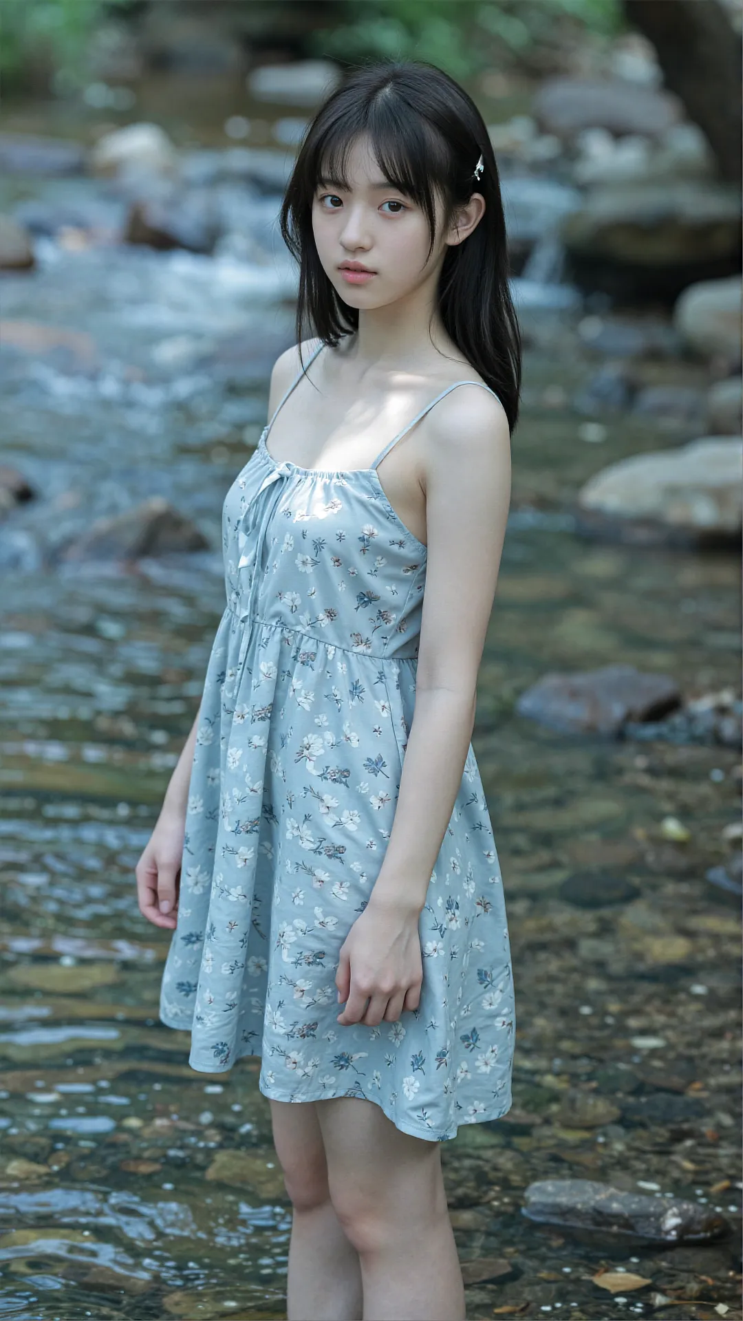 清浅溪涧潺潺流淌,少女赤脚立于微凉的水中,一袭浅蓝碎花吊带裙随微风轻漾,清新又灵动。她抬眸望向镜头,眼神清澈纯粹,不带一丝风尘,将夏日的清爽与少女的纯澈完美相融。