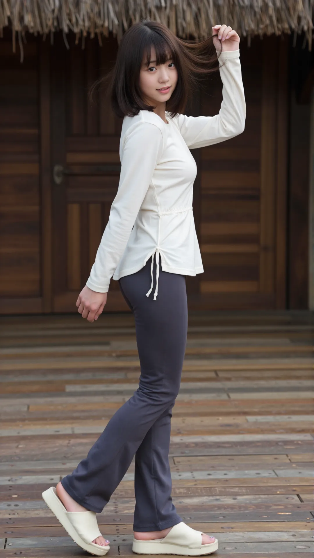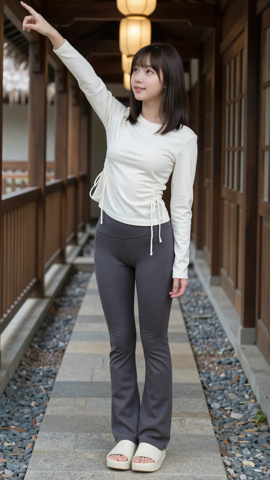 日式木质廊间,少女身着米白抽绳上衣与深灰紧身裤,简约穿搭勾勒出利落线条。她赤脚踩在拖鞋里,站在温润的木地板上,眉眼清秀,笑意温柔。