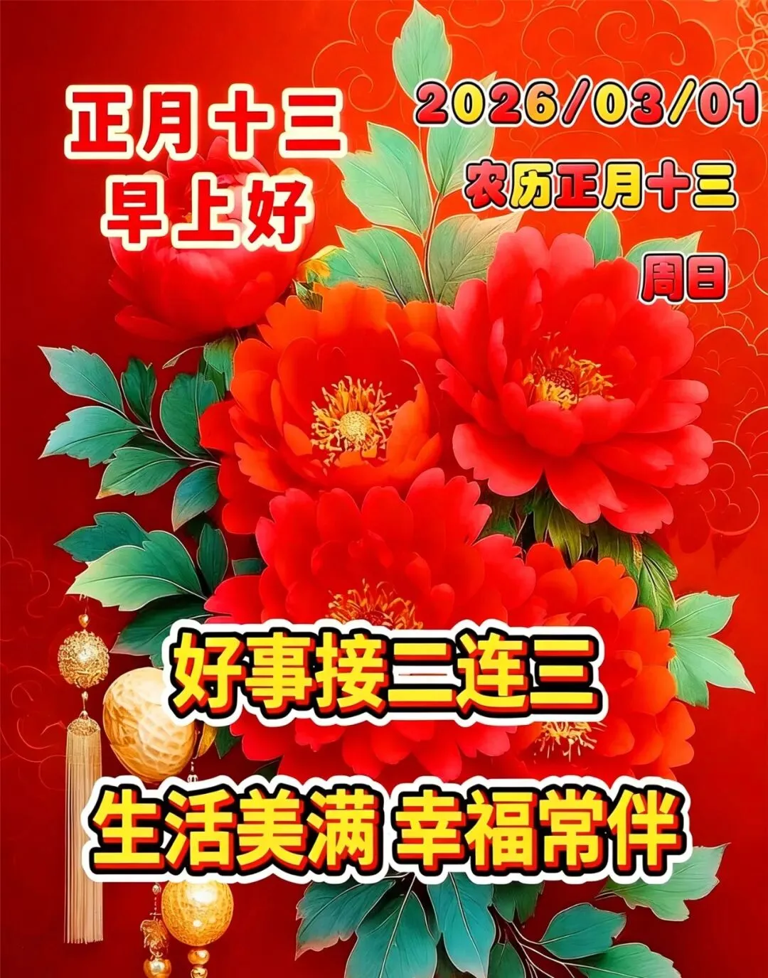 3月1日-正月十三漂亮图片祝福语+愿新的一年:好运接二连三!马年大吉大利,2026万事如意!