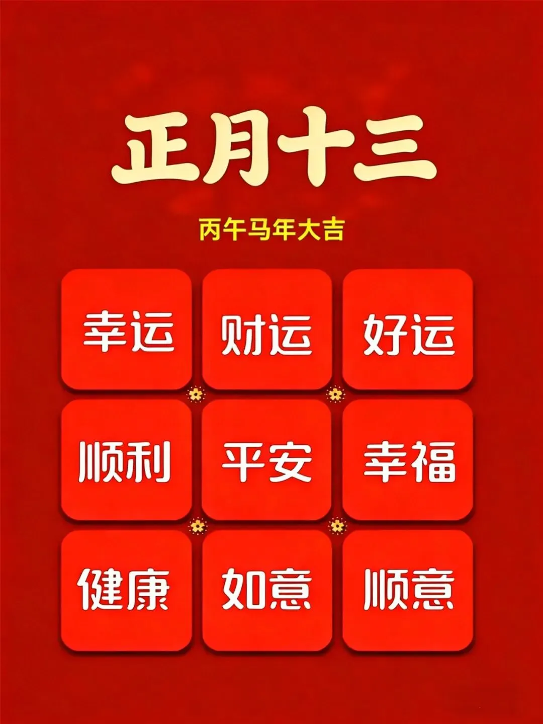 正月十三好兆头,马年好运开好头,愿你十二个月月月安康,一年四季季季平安,365天天天开心,万事顺顺当当,福气满满!