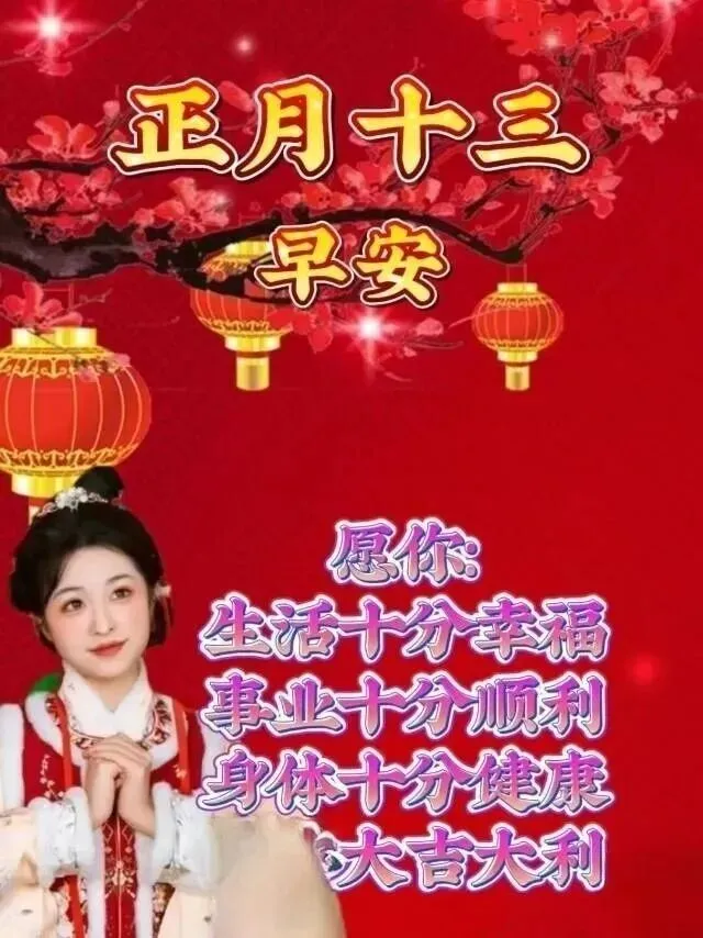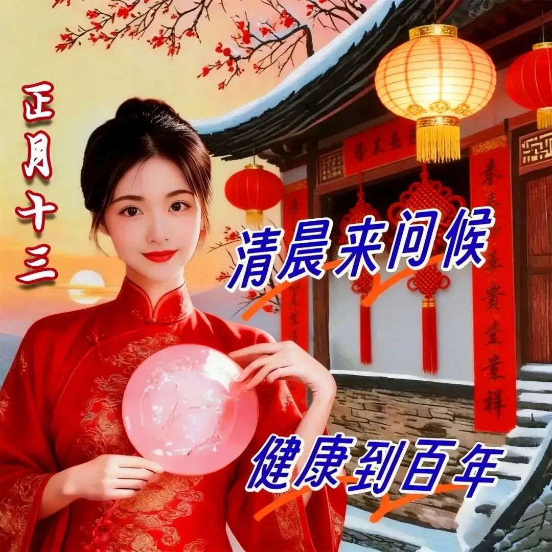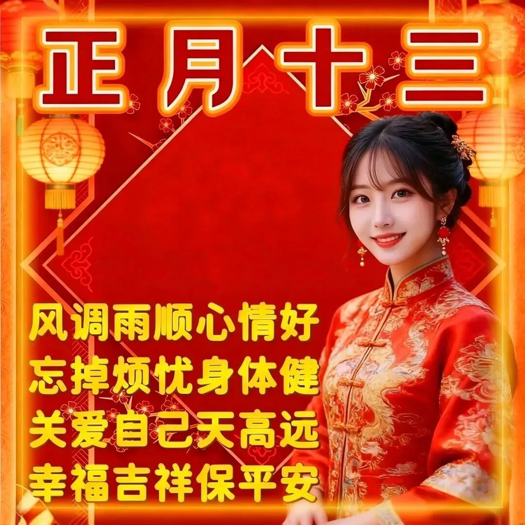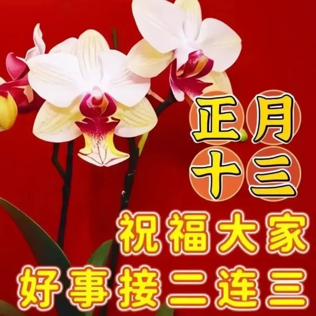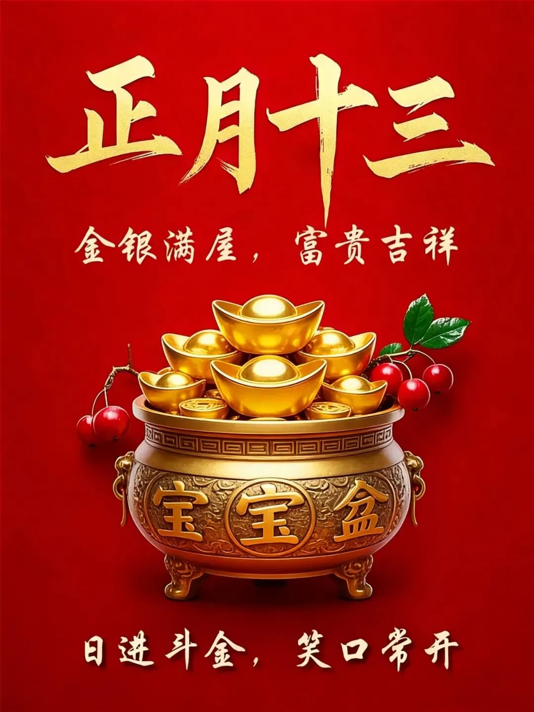正月十三送祝福,愿你财源滚滚,事业有成,家庭和睦,愿你日子红火,好运连连,梦想成真,愿你身体健康,万事顺意,平安喜乐!