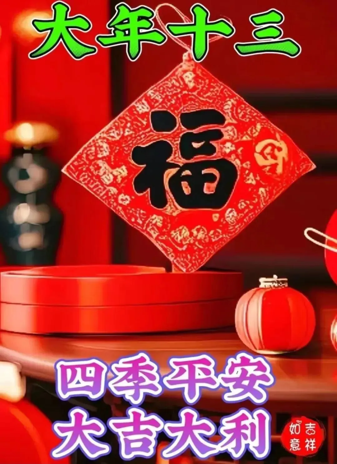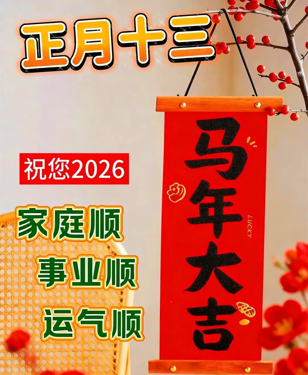大年十三来到,欢欢喜喜迎元宵,送上今日祝福:农历正月十三,好运接二连三。愿你天天好运到,日日福星照,幸福藏心头,万事不用愁。2026好运接二连三,财源滚滚而来!