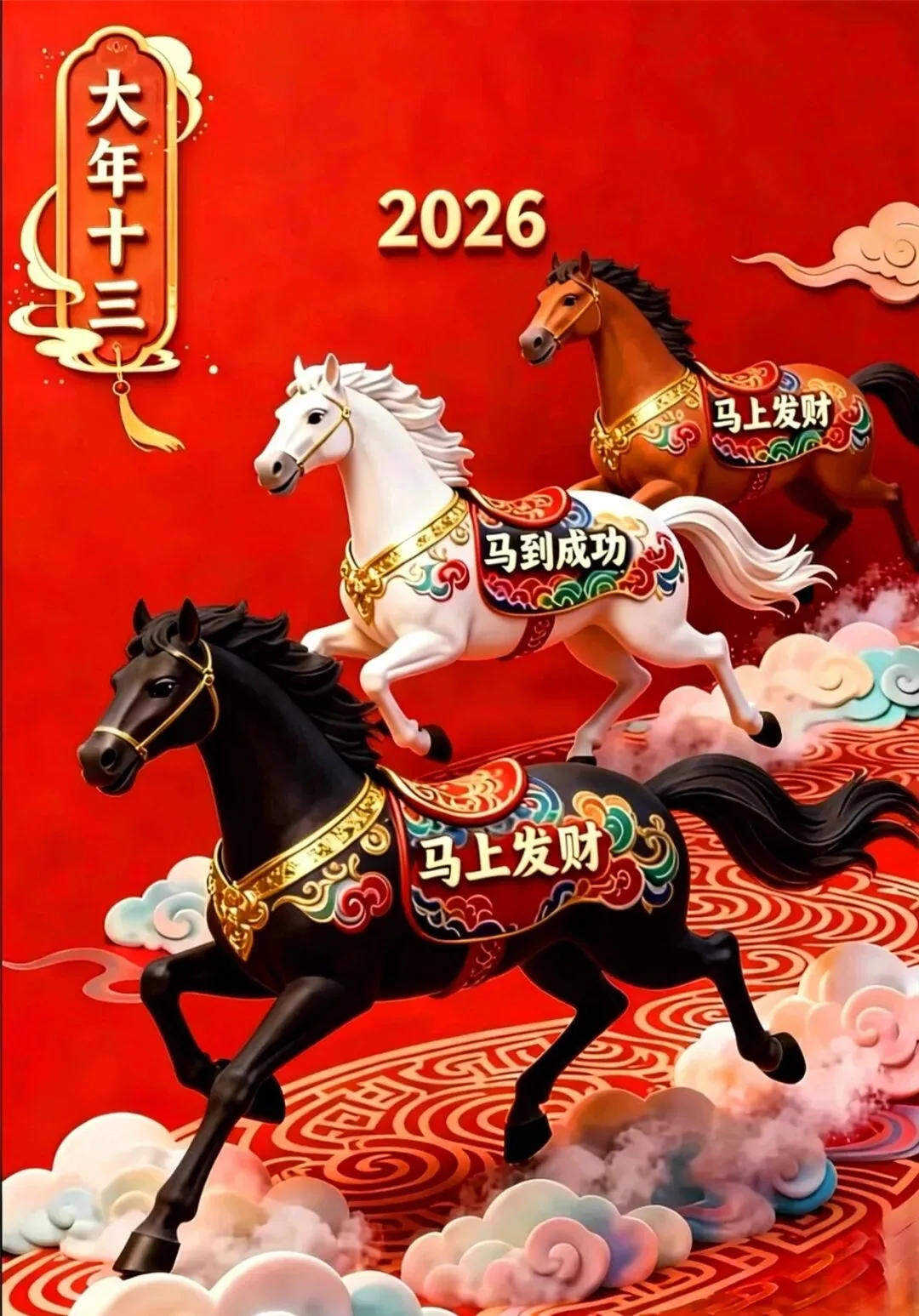马年到,好运到,大年十三,问声早!祝你马年吉星照,快乐相伴心情好,无忧无虑无烦恼,好运连连乐逍遥!