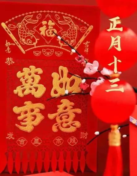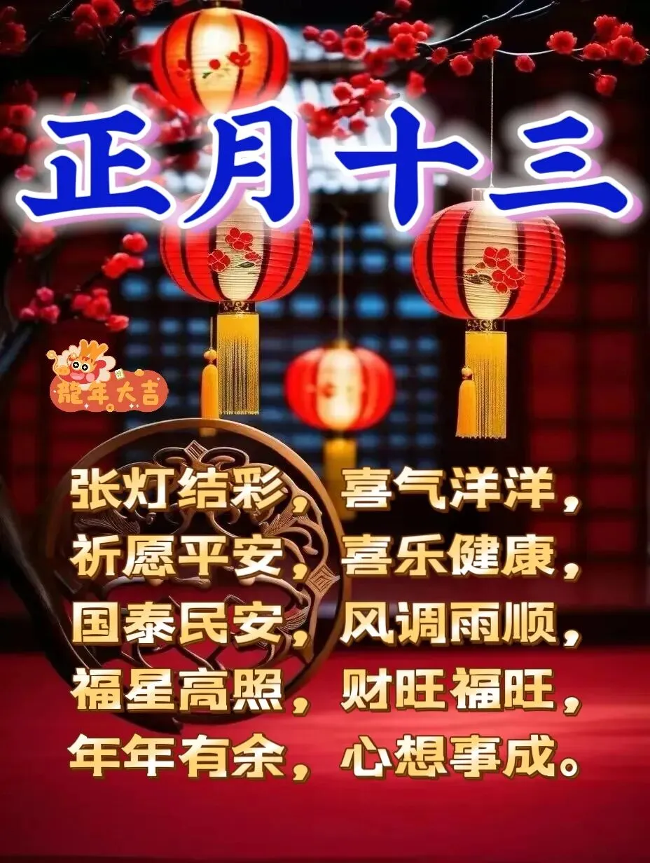 1、正月十三,上灯日。张灯结彩,喜气洋洋,祈愿平安,喜乐健康,国泰民安,风调雨顺,福星高照,财旺福旺,年年有余,心想事成。