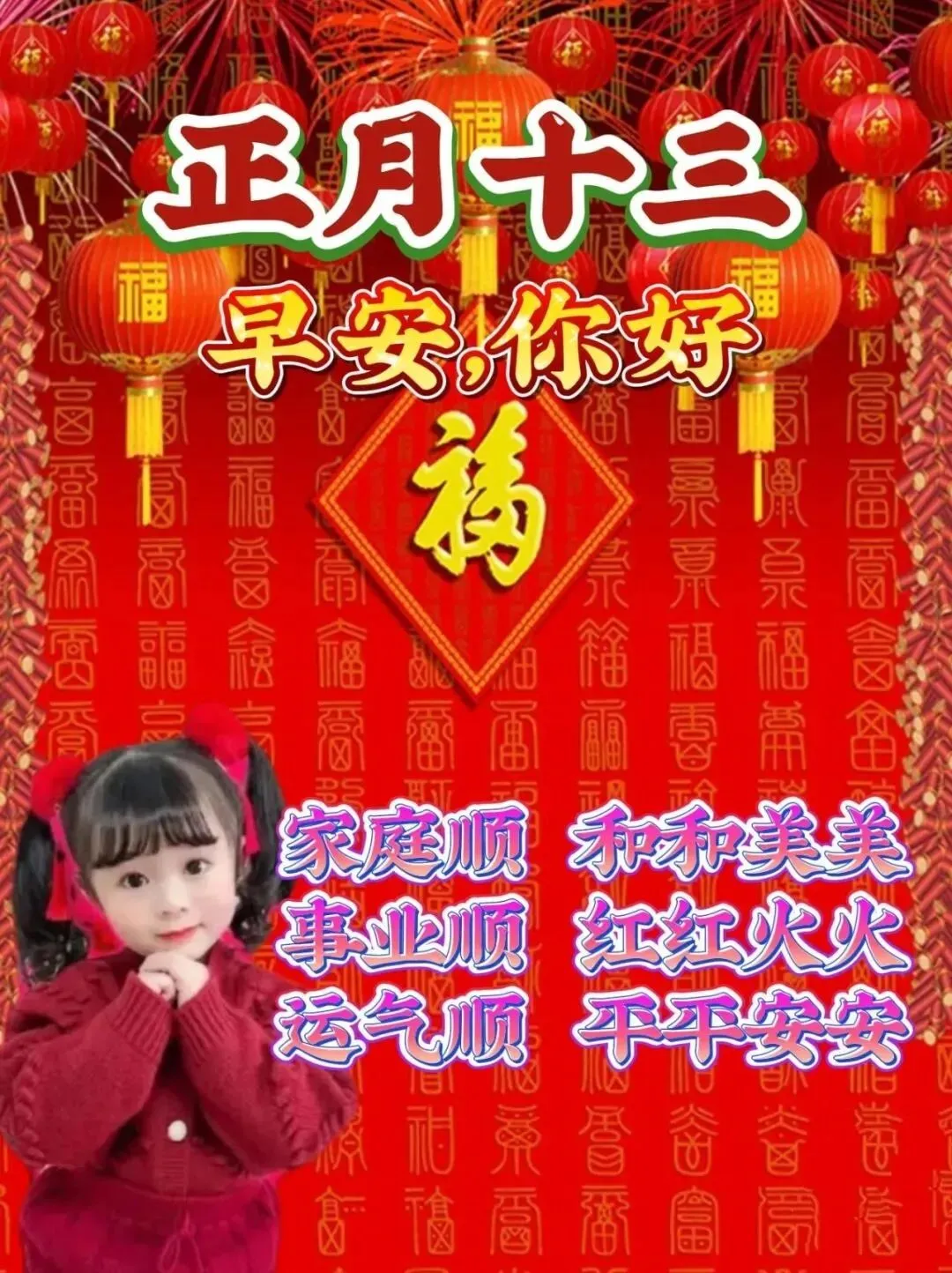 大年十三,祝您幸福一生,快乐一生,健康一生,平安一生。一年一度皆顺利,一夕一朝都欢喜,事业一马平川,生活一帆风顺,一路吉星高照,一生幸福安康。大年十三,向上生长,向美而生,向光而行。