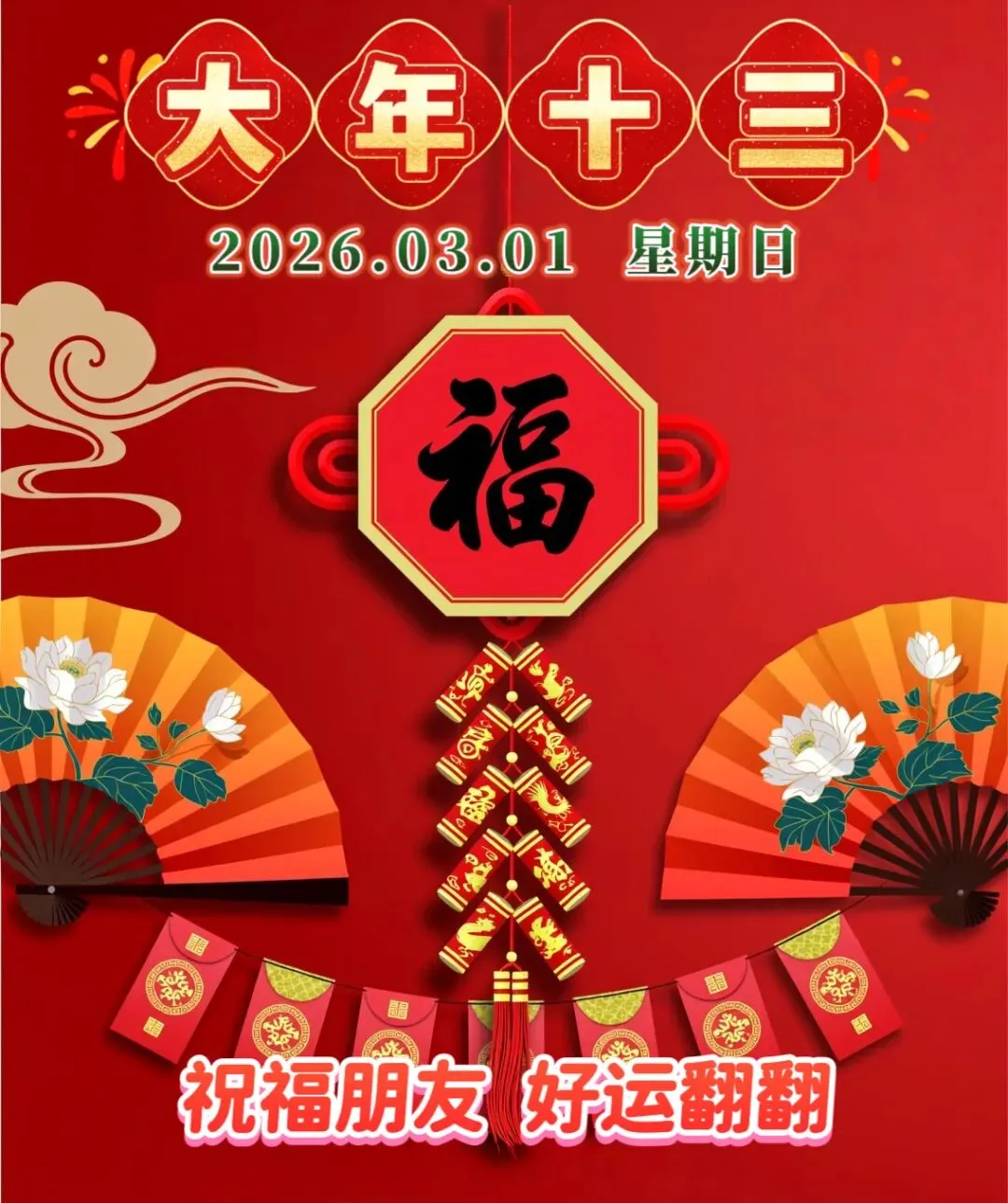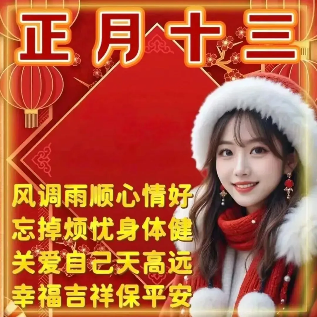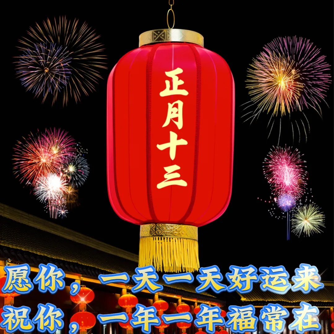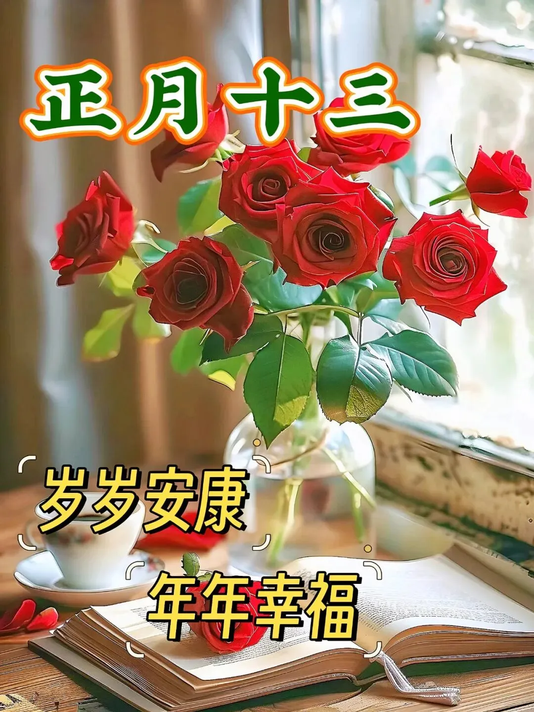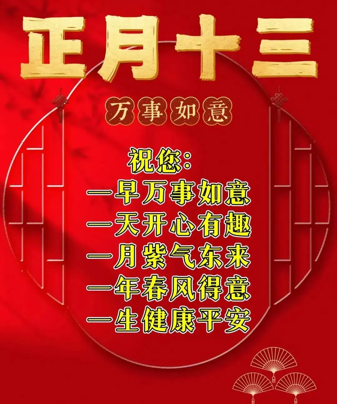 正月十三祝福到,一祝家祥和,二祝身健康,三祝事成功,四祝心如愿,五祝父母壮,六祝钱财旺,七祝友情长,八祝好运来,九祝爱情甜,十祝万事顺!🌹😊🌺☀️🍎🎉