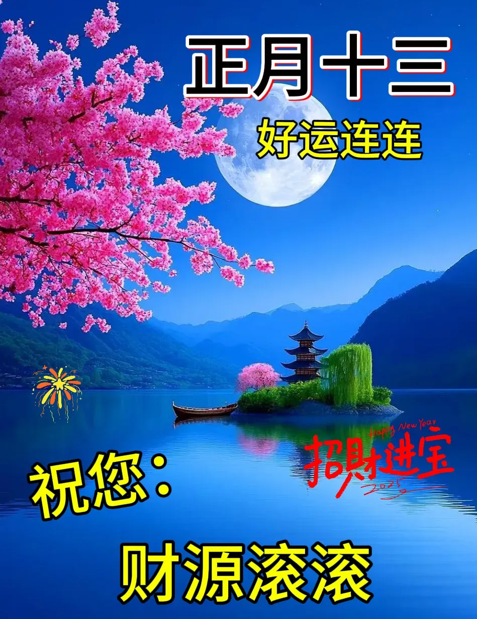 💝🍭正月十三晨曦来,清晨问候送祝福。🌾🙏祝朋友恭喜发财,财源滚滚如春水,身体健康长寿,健康滚滚如江河。🌹🍎新春吉祥如意,如意滚滚如春风,🌸💧快快乐乐过新年,年年欢乐不断,朋友永远幸福美满!🧡🌈
