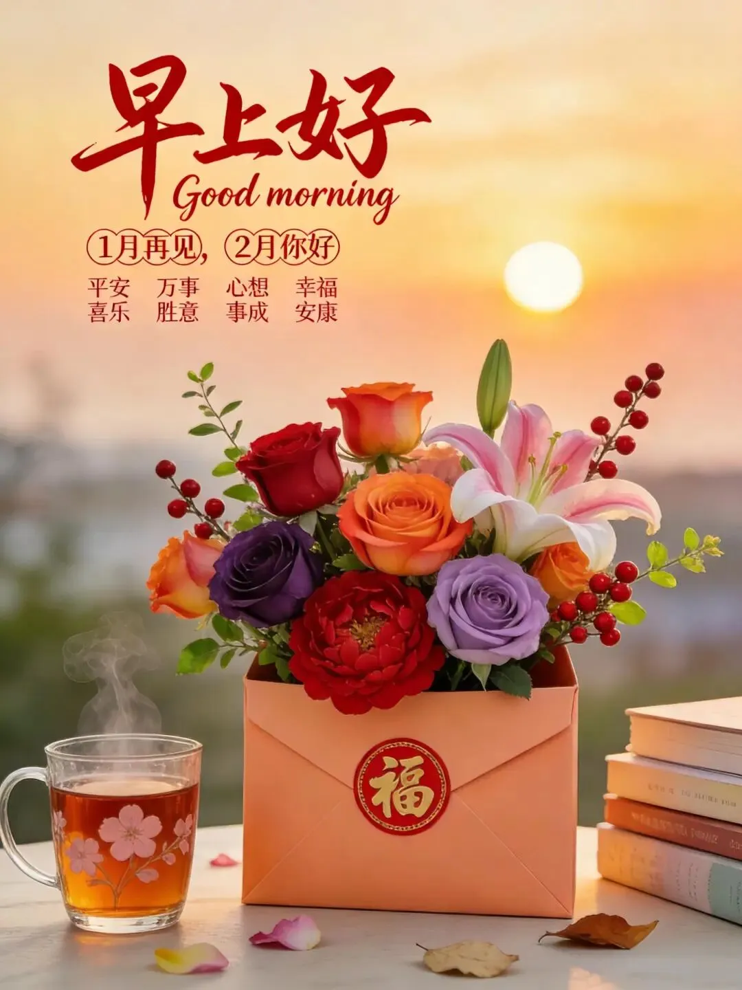 新的一天,新的开始,祝你一切顺利。让微笑温暖你的脸庞,让快乐填满你的心房,让好运时刻伴随左右,让成功紧握双手,让幸福永远绽放。早上好!🌹❤️😊☕️🍎