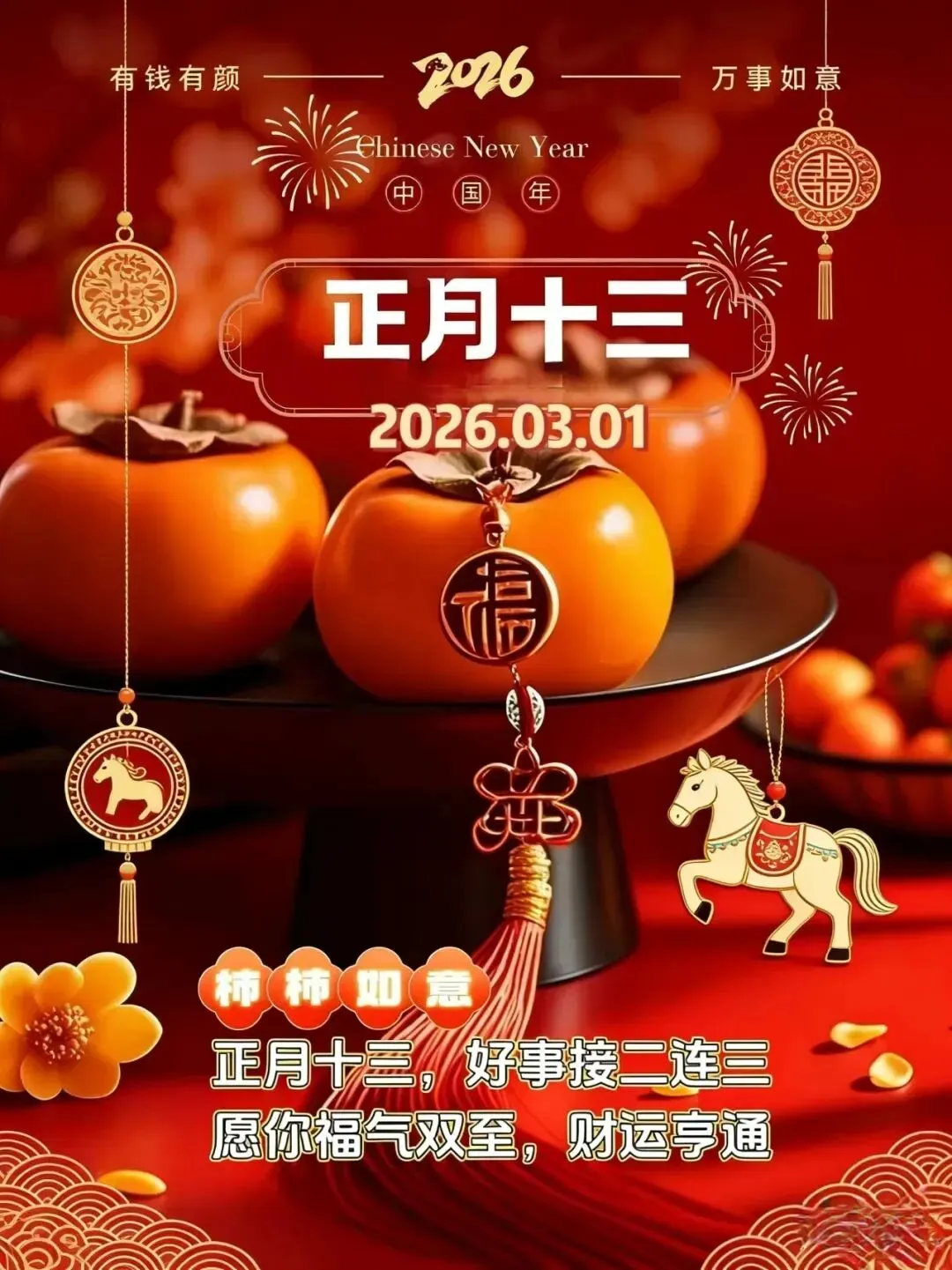 正月十三,祝愿你,福上有福!新的一年,拥有好的工作、好仕途、好前途;拥有好伴侣、好家庭;拥有好生活、好生活、好年景!生活吉祥,平安喜乐!丙午马年,希望你无忧无虑,没有苦恼事;开开心心,总能笑开颜。